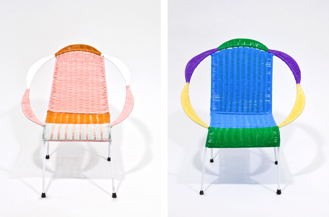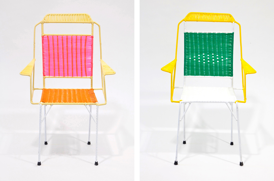 La casa de moda Marni presentó este proyecto en el Salón del Mueble, Milán. 100 chairs cuenta con ochenta sillas, diez mesas de jardín, y diez sillones de terraza, que utilizan limitadas variaciones de color y modelos, trabajadas por artesanos colombianos. Pitillas plásticas fueron utilizadas para cubrir las bases de metal, y los colores, veinte en total, fueron escogidos por los diseñadores de Marni para reflejar los colores más clásicos de ésta. La base de metal de las sillas no varían, mas el trabajo de los artesanos les otorga un toque único a cada una, entregando una personalidad diferente y propia que no se repite. Adicionalmente, estas sillas servirán como parte del proyecto del fotógrafo Francesco Jodice “El arte del retrato”, donde serán el escenario de la fotografía.