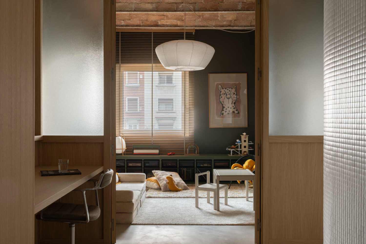 La organización espacial favorece la apertura y la fluidez. Cocina, comedor y estar conforman un núcleo luminoso, acompañado por un cuarto de juegos integrado y una oficina delimitada por una mampara translúcida de vidrio y roble que filtra la luz sin fragmentar el espacio. Las áreas privadas apuestan por la simplicidad y el orden, reforzadas por soluciones de almacenamiento a medida. Con una iluminación suave y control solar mediante persianas venecianas, el resultado es un refugio coherente y atemporal, donde la funcionalidad se transforma en una experiencia doméstica pausada.