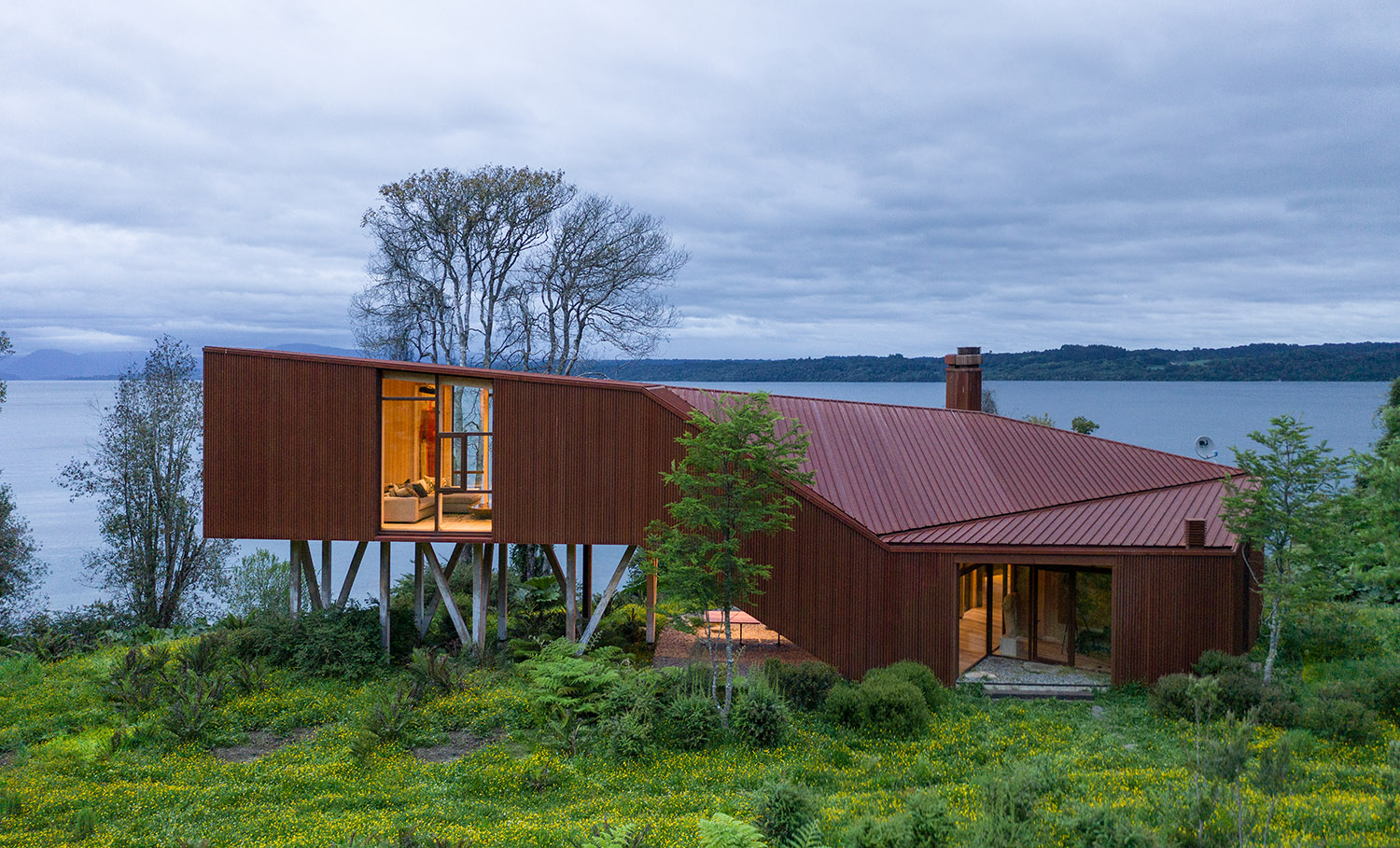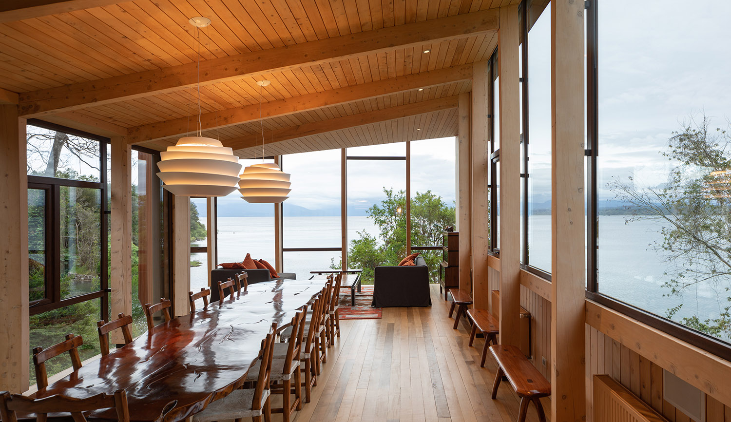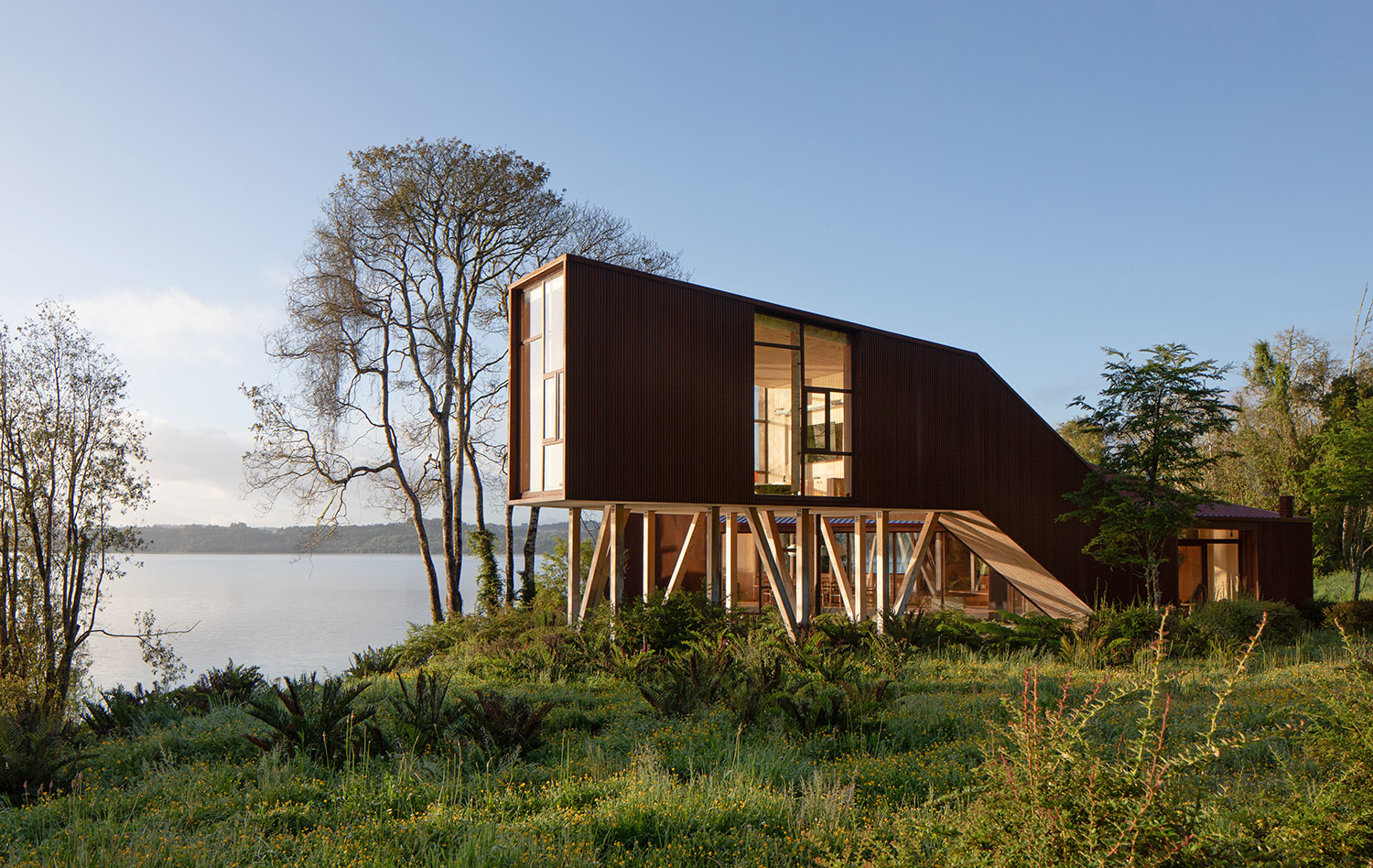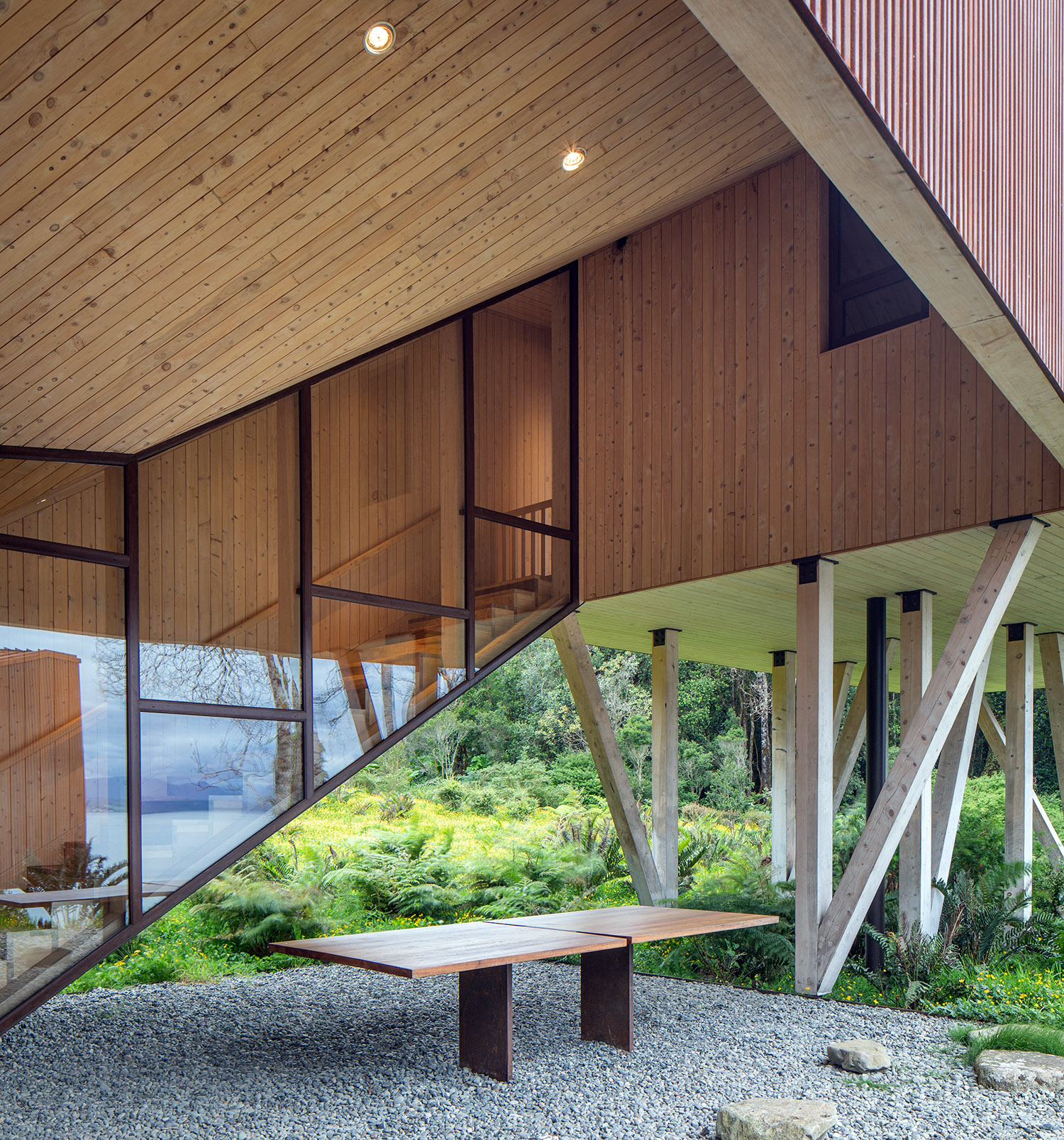 El trabajo de los arquitectos en este terreno ubicado en la ribera oriente del Lago Rupanco, en Osorno, lleva ya varios años. En primera instancia diseñaron la casa principal, a la que posteriormente se sumaron otras construcciones propias de un predio agrícola, una galería para la colección de arte de los propietarios y finalmente este pabellón multifuncional en paralelo al desarrollo de un parque. La palabra Apus viene del quechua y hace referencia a los espíritus de las montañas sagradas, este término fue escogido para bautizar el proyecto porque la vivienda fundacional se ubica sobre una meseta que le permite observar el lago desde las alturas. Kankay en tanto, significa “asar” y remite al ritual de la comida en torno al fuego. Esa es justamente una de las funciones de este nuevo volumen: proporcionar un lugar de reunión para la vida familiar.