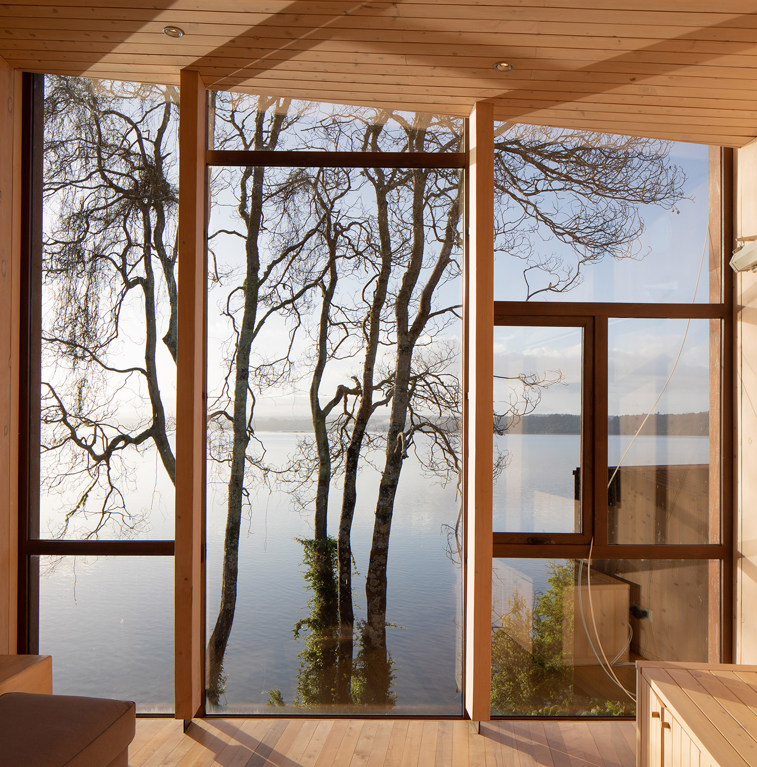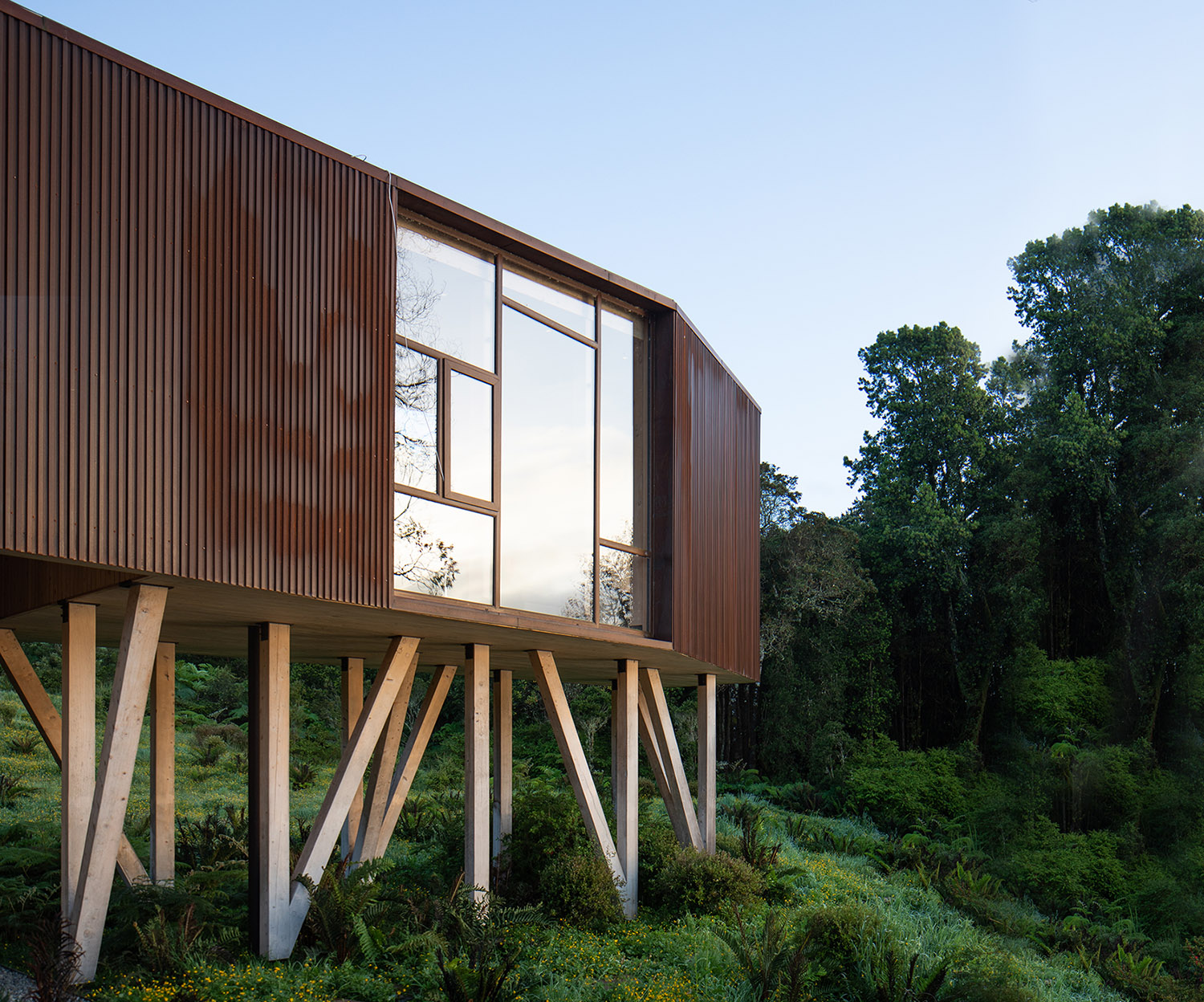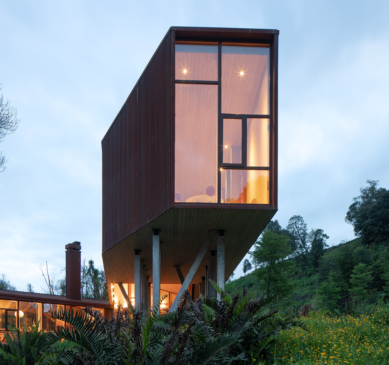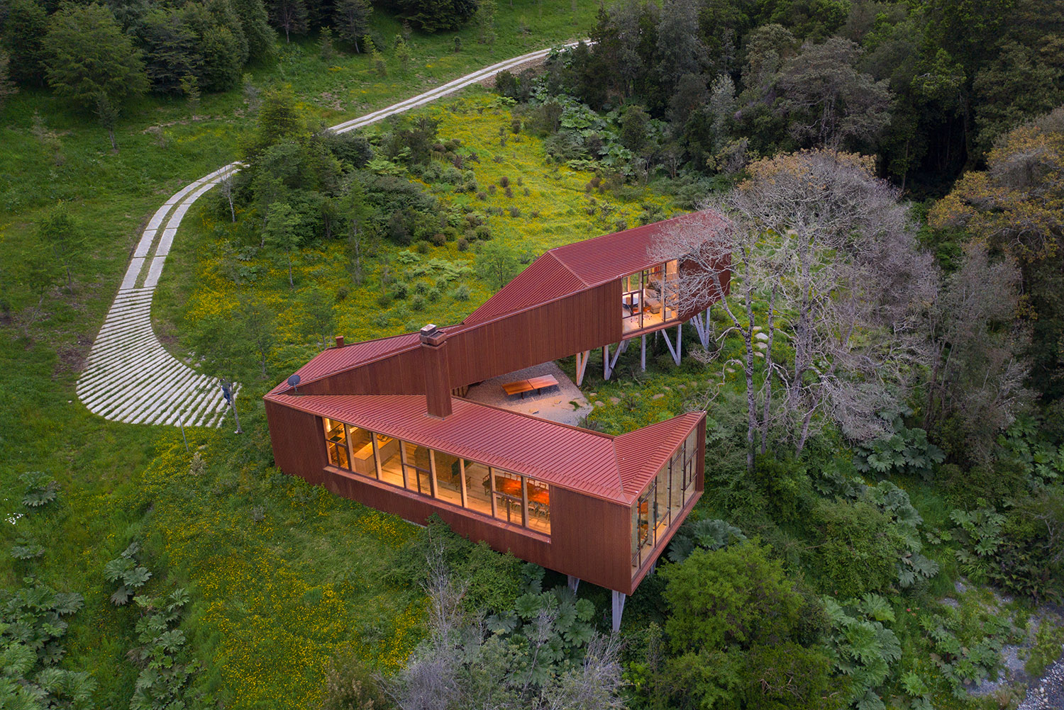 El trabajo de los arquitectos en este terreno ubicado en la ribera oriente del Lago Rupanco, en Osorno, lleva ya varios años. En primera instancia diseñaron la casa principal, a la que posteriormente se sumaron otras construcciones propias de un predio agrícola, una galería para la colección de arte de los propietarios y finalmente este pabellón multifuncional en paralelo al desarrollo de un parque. La palabra Apus viene del quechua y hace referencia a los espíritus de las montañas sagradas, este término fue escogido para bautizar el proyecto porque la vivienda fundacional se ubica sobre una meseta que le permite observar el lago desde las alturas. Kankay en tanto, significa “asar” y remite al ritual de la comida en torno al fuego. Esa es justamente una de las funciones de este nuevo volumen: proporcionar un lugar de reunión para la vida familiar.