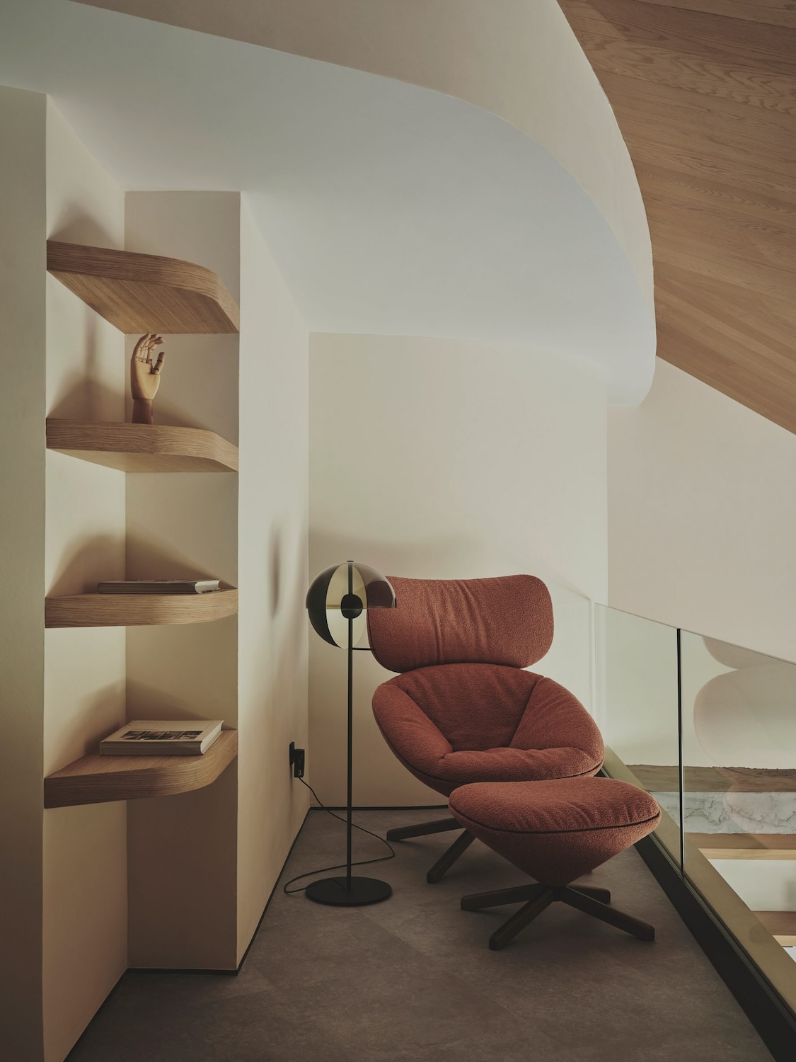 La materialidad acompaña esta intención: roble, arcilla y porcelana en tonos neutros acentúan la serenidad del diseño. Los interiores se han despojado de particiones innecesarias para lograr fluidez y amplitud. El almacenamiento perimetral mantiene las líneas despejadas, mientras que el mobiliario de formas suaves refuerza la sensación de continuidad.