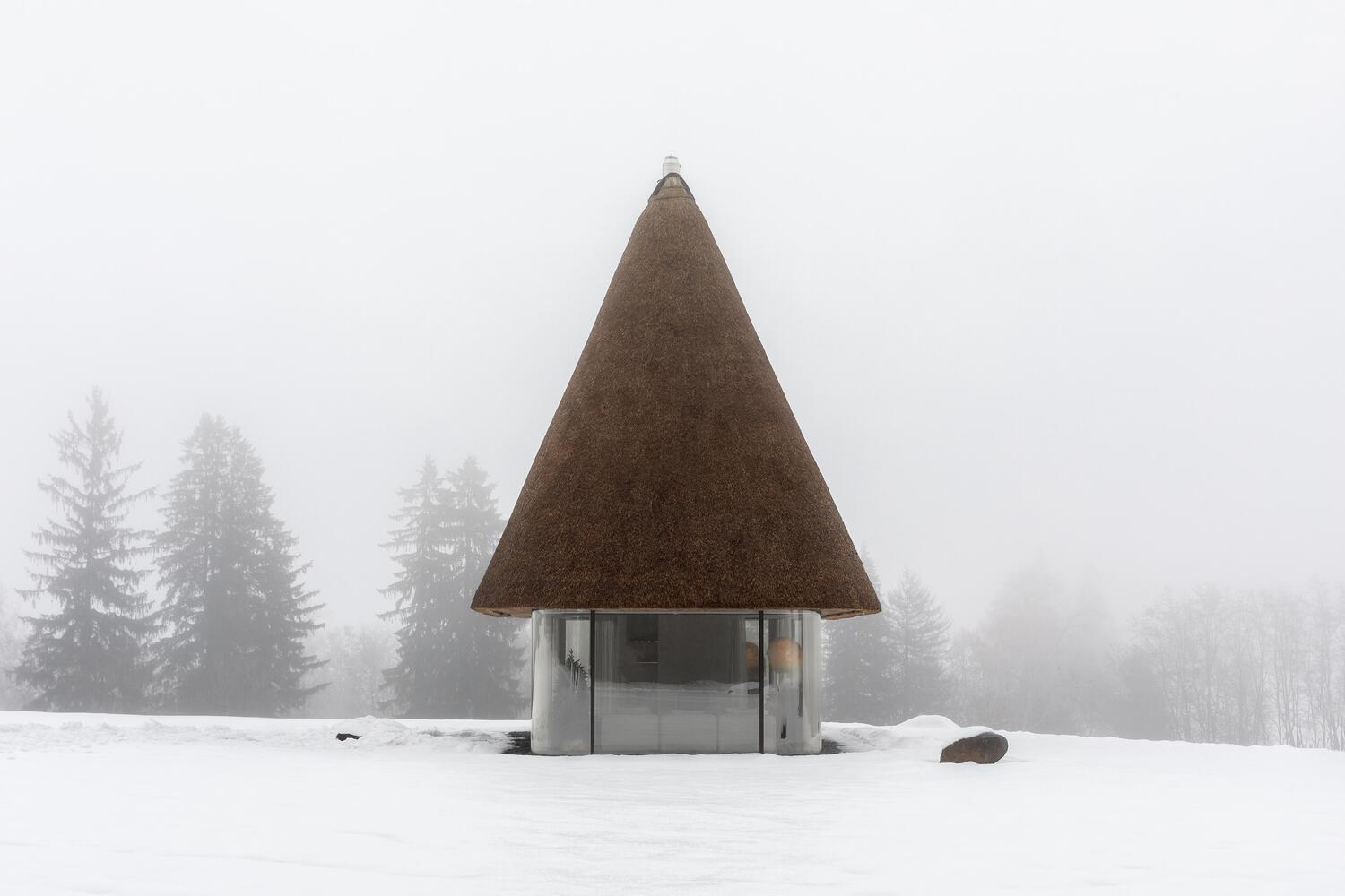 YOD Group reinterpreta la tradicional Hata-Mazanka ucraniana a través de una pieza contemporánea donde el gesto arquitectónico principal es un techo sobredimensionado de paja que parece levitar sobre el paisaje. Inspirado en las gruesas paredes encaladas y los techos de fibras naturales de la arquitectura vernácula, el proyecto transforma la búsqueda histórica de luz y orden en fachadas completamente acristaladas. La silueta escultórica, entre sombrero tradicional y hongo emergente, construye una imagen icónica que sintetiza memoria cultural y lenguaje actual.