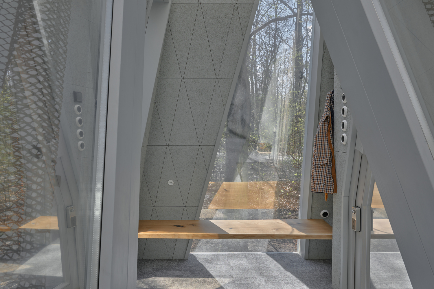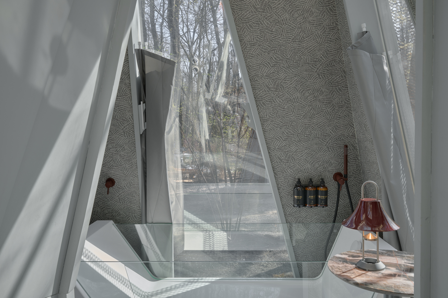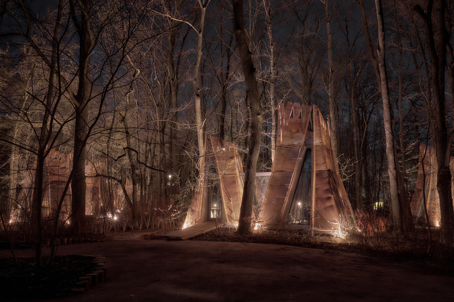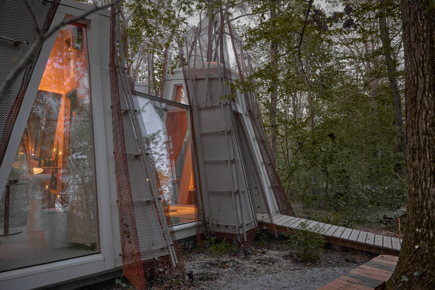 Entre los árboles de un parque en Kyiv, emerge un nuevo modelo de hospitalidad: Cabañas Namety, un sistema modular que reinterpreta la experiencia de acampar con una estética contemporánea y profundamente evocadora. Firmado por los ucranianos Roman & Dmytro Seliuky, el proyecto se inspira en la memoria infantil de construir refugios con ramas y propone pequeños módulos minimalistas que se ensamblan con libertad, como tiendas de campaña dispuestas de forma orgánica en un bosque. Cada módulo tiene una función única y puede conectarse con otros mediante transiciones de vidrio que permiten una composición fluida y transparente. Esta estructura abierta y combinatoria genera escenas arquitectónicas dinámicas, donde los volúmenes parecen girar sutilmente entre sí. La envolvente de malla de acero corten, que evoca la tela de una carpa ondeando al viento, permite que el conjunto se transforme según la luz, el clima y la estación, camuflándose con el entorno o brillando desde dentro por la noche.