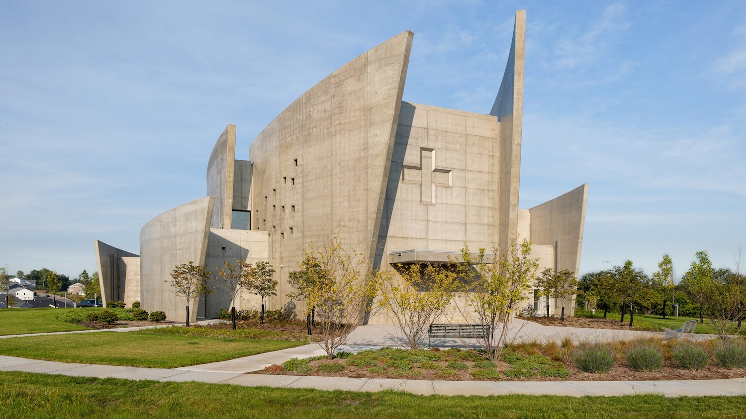 En el Cementerio de la Resurrección, en St. Louis, Missouri, la Capilla del Cristo Resucitado emerge como un volumen escultórico donde el hormigón se convierte en lenguaje espiritual. Diseñada por la firma estadounidense Design Alliance Architects y finalizada en 2025, la capilla de 795 metros cuadrados se compone de ocho muros curvos de hormigón que se elevan hasta los 15 metros de altura, configurando una estructura que combina función y simbolismo. Su curvatura concéntrica hacia la nave representa la expansión del Evangelio, mientras que la fragmentación de los muros evoca el cuerpo de Cristo en la cruz.