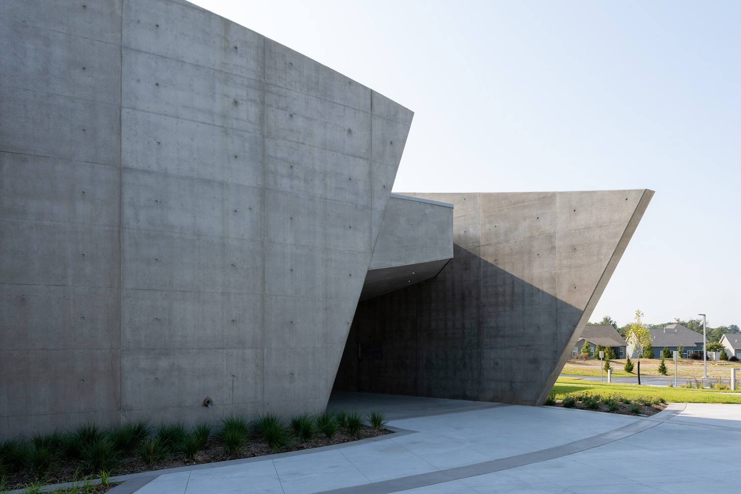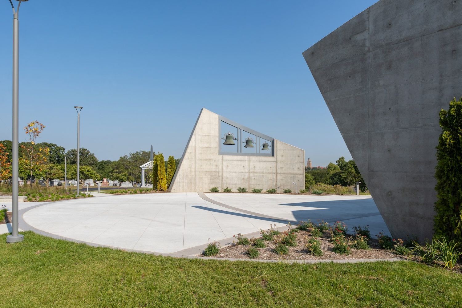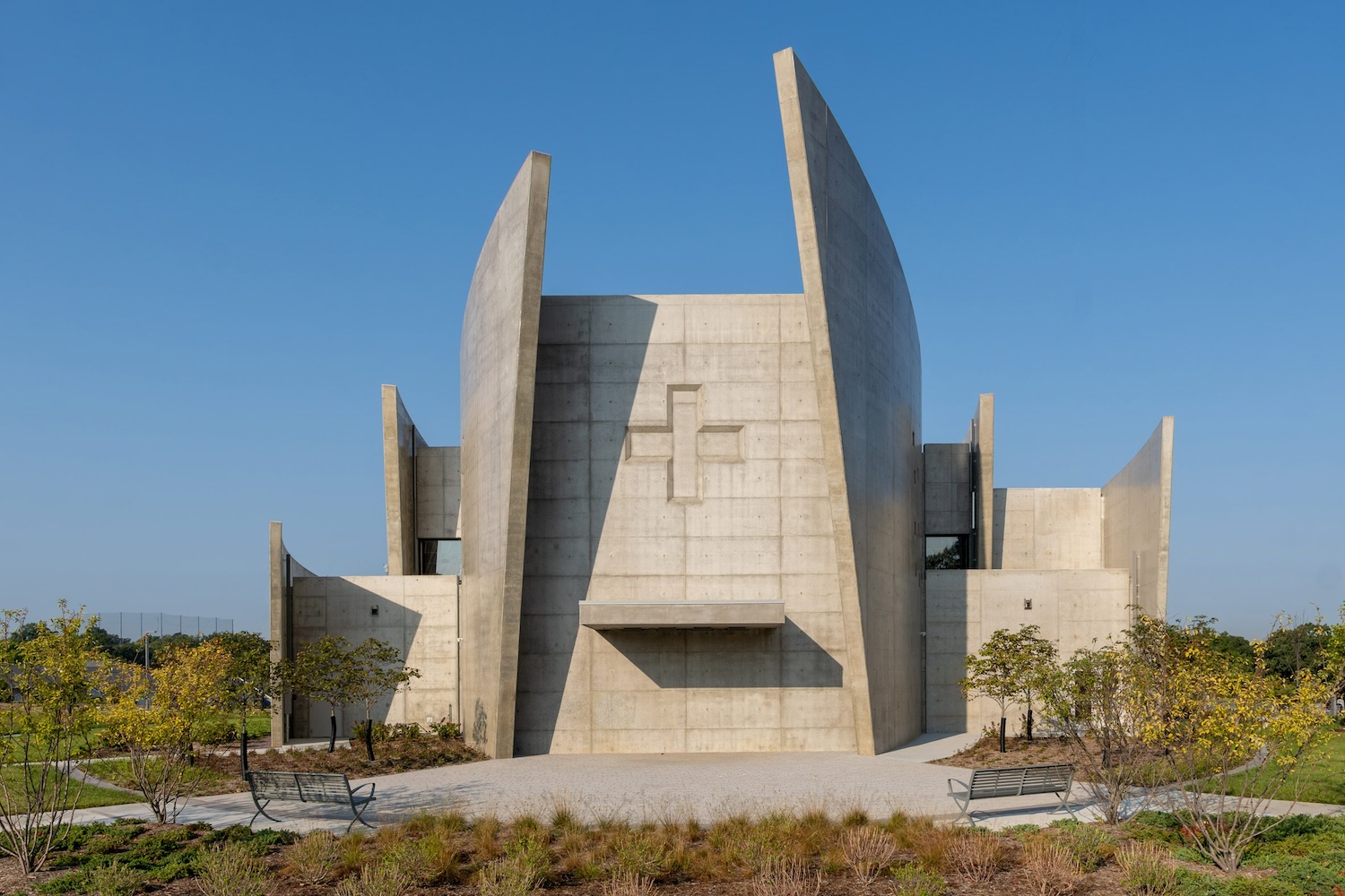 El proyecto adopta una estética brutalista que dialoga con la solemnidad del paisaje funerario. El hormigón en bruto define un exterior austero que dirige la mirada hacia el cielo, reforzando el carácter contemplativo del edificio. En el interior, el techo asciende desde nueve hasta treinta pies sobre el altar, construyendo una experiencia espacial que sugiere la ascensión y enfatiza el altar como centro organizador del conjunto.
