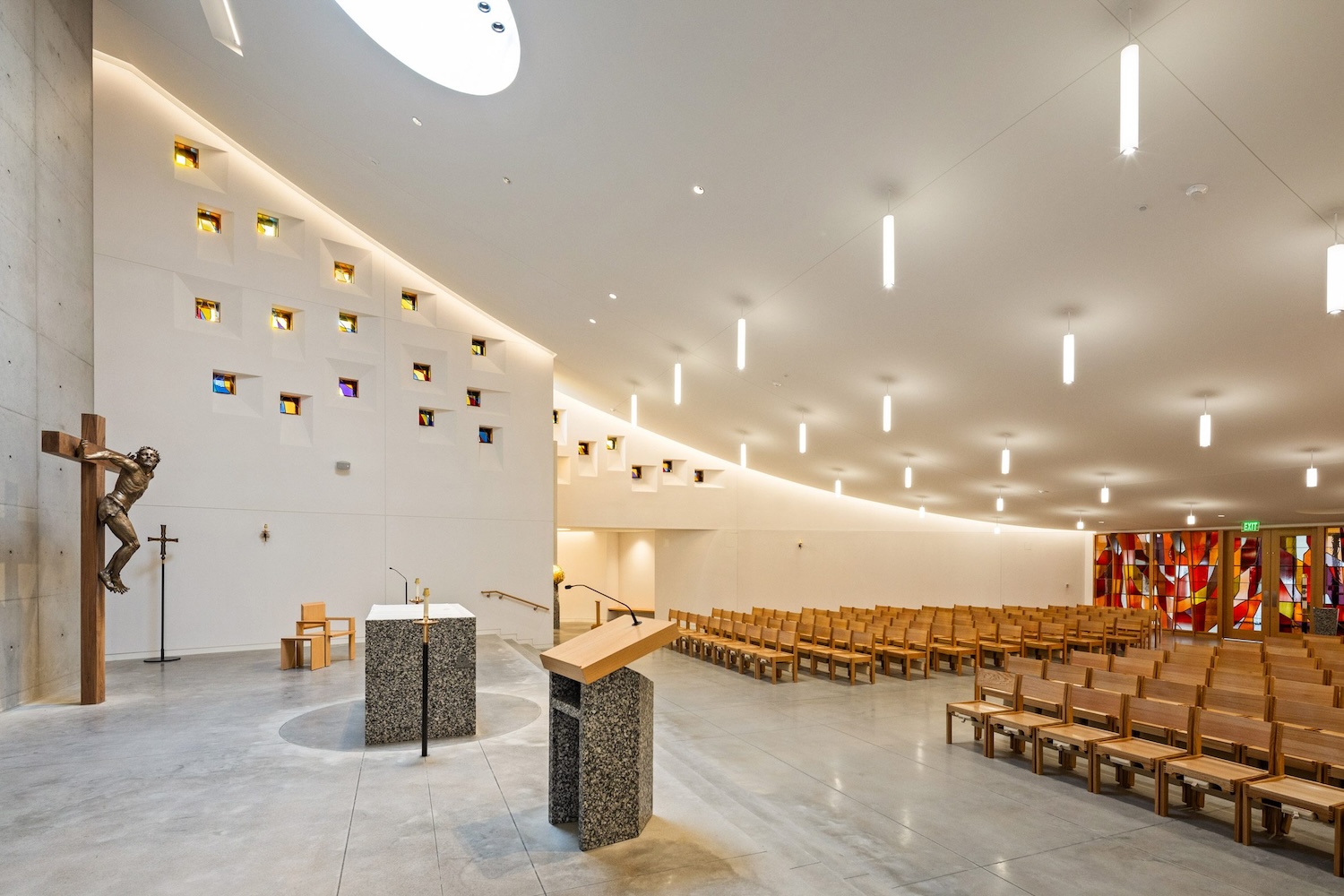 La luz natural se convierte en protagonista a través de un tragaluz circular y una serie de vidrieras insertas entre los muros curvos, que tiñen el espacio de color a lo largo del día. Este gesto introduce una dimensión simbólica y sensorial que equilibra la crudeza del hormigón, complementada por elementos de madera que aportan calidez. En una ciudad donde el brutalismo suele expresarse mediante planos rectos, la capilla destaca por su gesto curvo y ascendente, proponiendo una arquitectura que transforma la materialidad en experiencia espiritual.