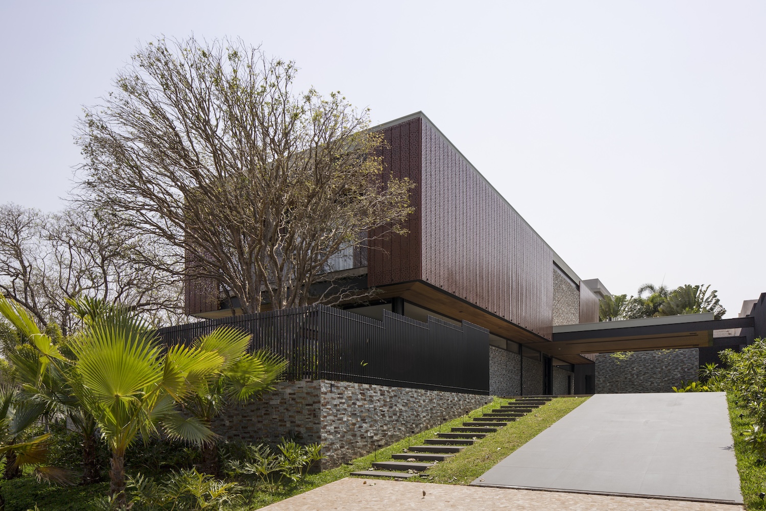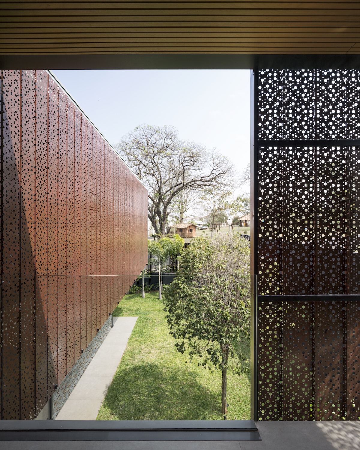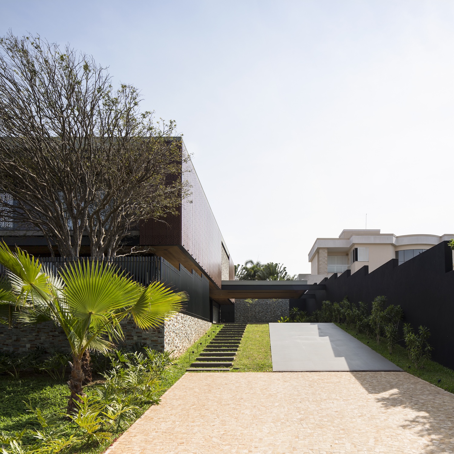 El paisaje, cuidadosamente diseñado, incorpora elementos tropicales y memorias del terreno original, como el árbol de jabuticaba que marca la entrada como símbolo de pertenencia.