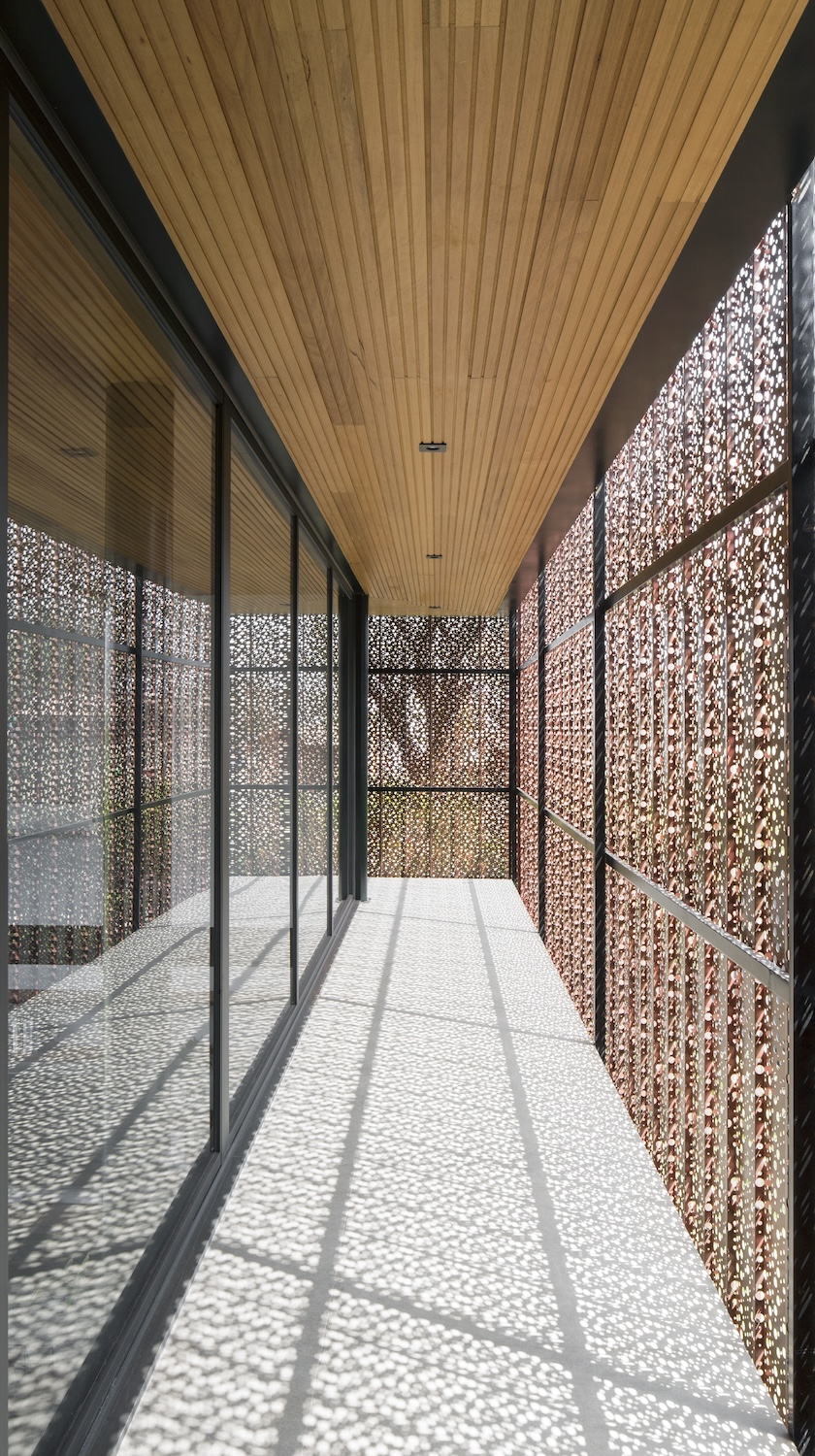 La estructura metálica y las superficies de piedra natural dialogan con brise-soleils que regulan la luz y la temperatura, generando un ambiente cambiante a lo largo del día. La vivienda no solo responde al contexto natural, sino también al deseo de integración familiar. Desde el área gourmet conectada al exterior hasta las amplias visuales que atraviesan los ventanales, todo en Casa Brise invita a compartir.