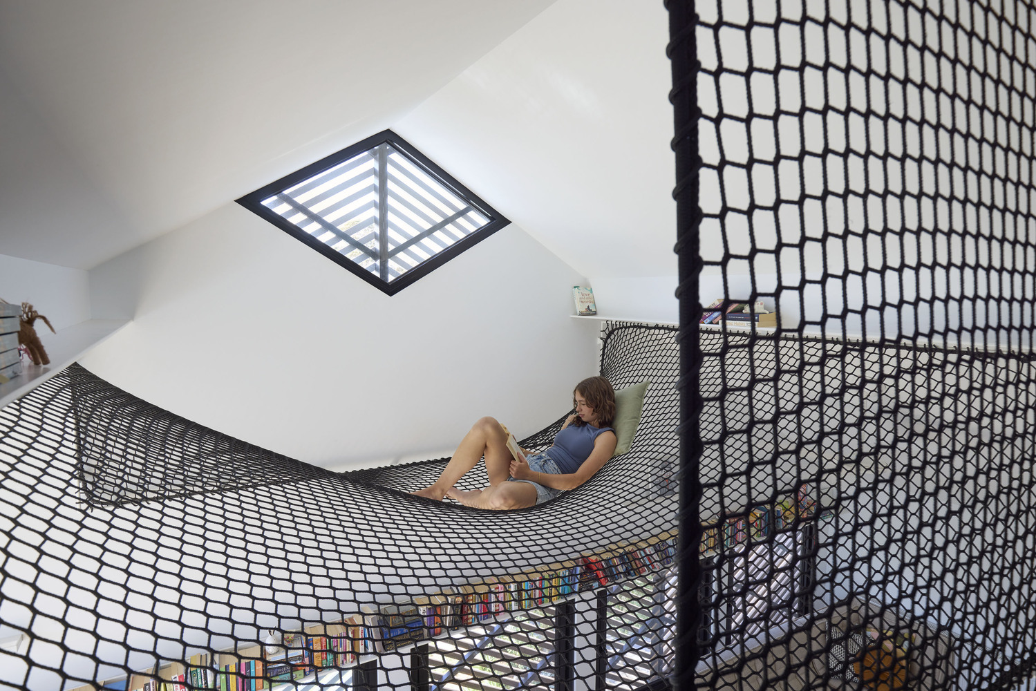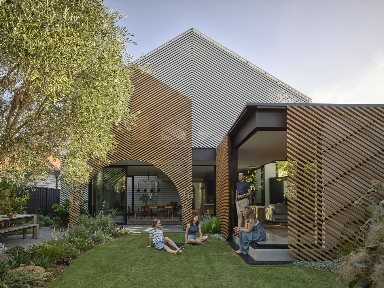 Una pantalla de listones unifica la estructura original con la ampliación, mientras que el uso interno de materiales como las tablas de intemperie y el pavimento de piedra azul refuerza el carácter de transición y fusión entre interior y exterior. Lejos del modelo genérico de planta abierta, Casa Clarke ofrece volúmenes que se estiran, se separan y se encajan para favorecer tanto el encuentro como la soledad. Una hamaca en altura, una sala de manualidades rosa y una sala de estar que se proyecta como pabellón al jardín revelan que aquí, la arquitectura no es solo contenedor, sino también contención emocional.