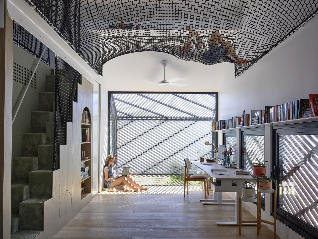 El proyecto no se limita a añadir metros cuadrados: reconfigura por completo la experiencia de habitar. Una nueva entrada lateral, jardines de bolsillo y una secuencia de espacios interconectados —desde una oficina hasta un “apartamento” adolescente suspendido sobre una escalera perforada— redefinen el concepto de vivienda familiar.