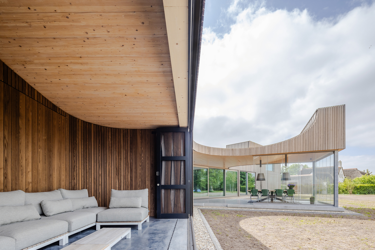 Cinco volúmenes de madera se entrelazan como una coreografía de luz, viento y reflejos, revelando una relación íntima entre espacio, cuerpo y naturaleza. Inspirada en la tradición naval, la casa adopta la precisión artesanal de la carpintería en CLT y los techos curvos evocan cascos de barco invertidos. Cada detalle responde a una lógica de equilibrio entre construcción y paisaje, entre estructura y poesía.