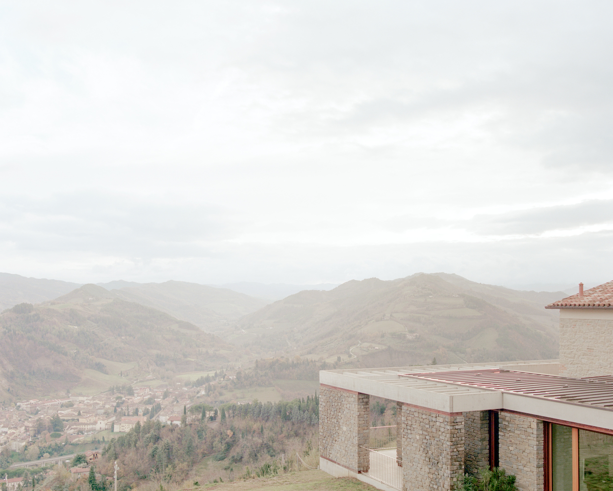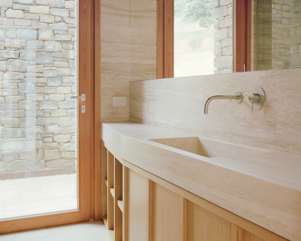 La ampliación se despliega de manera lineal siguiendo la pendiente, revestida en piedra y en sintonía con la escala y materialidad existentes, aunque desde un lenguaje más abstracto y contenido. Un sistema de pilares y pórticos de mampostería organiza una secuencia rítmica de llenos y vacíos en la que luz y paisaje adquieren un papel estructurante. Las grandes aberturas encuadran el valle y convierten la fachada en un plano activo que media la relación entre interior y exterior.