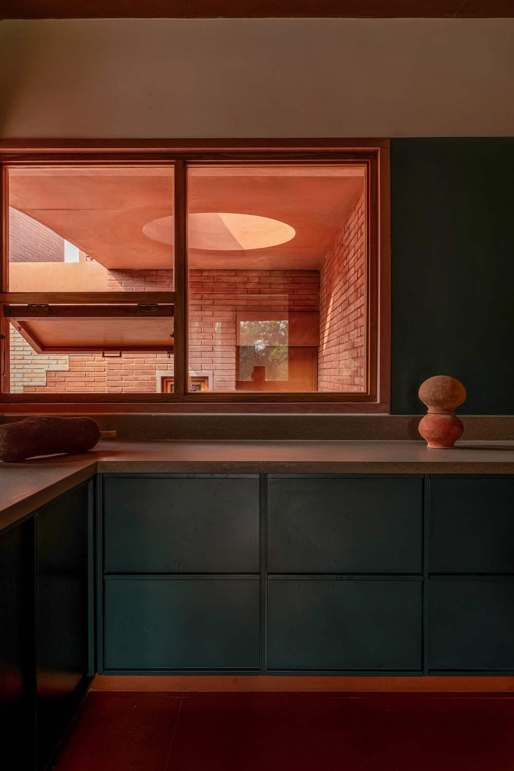 La distribución no sigue una lógica lineal, sino sinánea: un recorrido pausado donde los techos se vuelven miradores y los pasillos, jardines silenciosos. Cada material cuenta una historia. Desde los ladrillos de terracota sin cocer —fabricados con residuos reciclados— hasta el hormigón pigmentado que estructura el conjunto, la casa se funde con el entorno sin alardes.