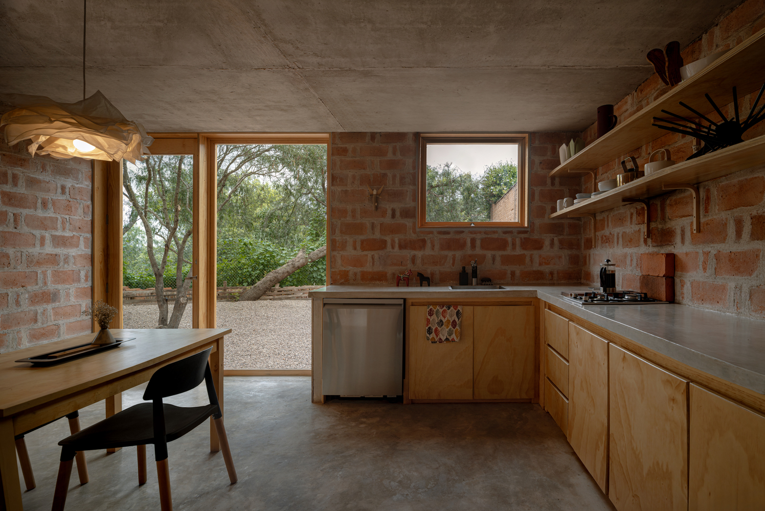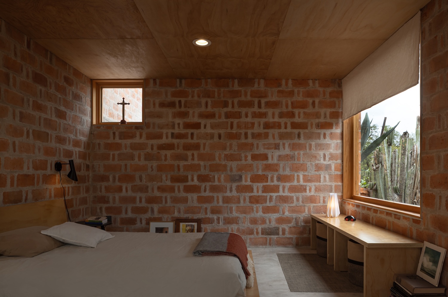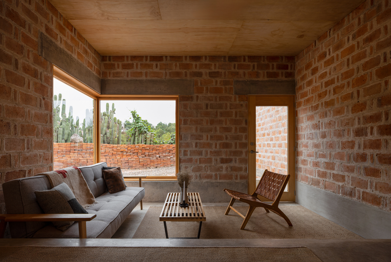 El proyecto se organiza en torno a patios centrales que modulan la luz, regulan la temperatura y fomentan una atmósfera de silencio y reclusión. El uso de ladrillo rojo cocido de producción local, junto con la técnica de enhuacalado, asegura eficiencia térmica y constructiva, al tiempo que refuerza la autenticidad material del conjunto. Aberturas precisas conectan los espacios interiores con el jardín, intensificando la relación entre adentro y afuera.