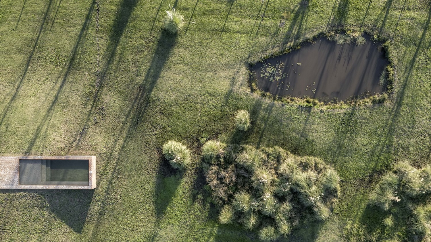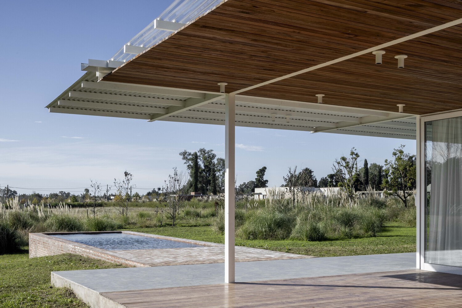 La cercanía al arroyo y la pendiente del terreno exigieron una nivelación cuidadosa. Se resolvió con la extracción de material del mismo suelo, gesto que culmina en un espejo de agua integrado al entorno. La estructura metálica soldada da a la casa un carácter híbrido que equilibra eficiencia y sensibilidad territorial. Ladrillo, madera y vidrio se combinan en un ritmo espacial que refuerza la relación con el sitio y acompaña la vida cotidiana de su única habitante en un refugio donde se encuentran introspección, paisaje y estructura.