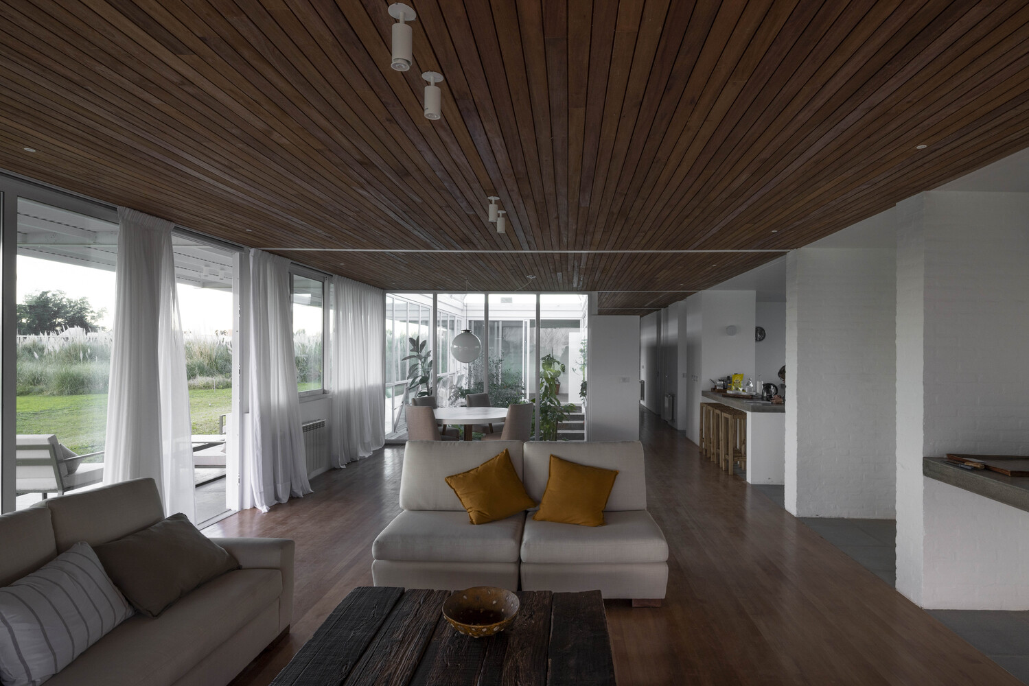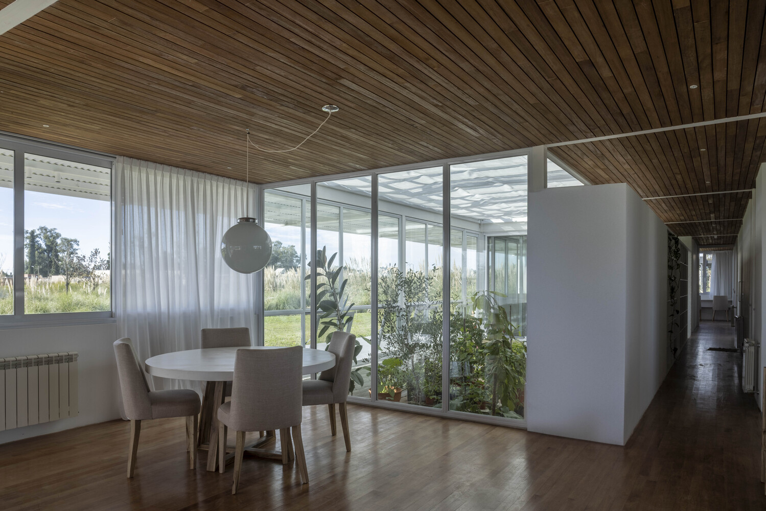 El centro de la vivienda es un invernáculo interior que actúa como vacío organizador. Separa las áreas públicas de las privadas y convierte la biblioteca en un puente longitudinal que acompaña el recorrido. Hacia la calle, un frente de servicios más compacto crea un filtro entre la vida urbana y el interior verde, además de proteger la casa de los vientos del sur.