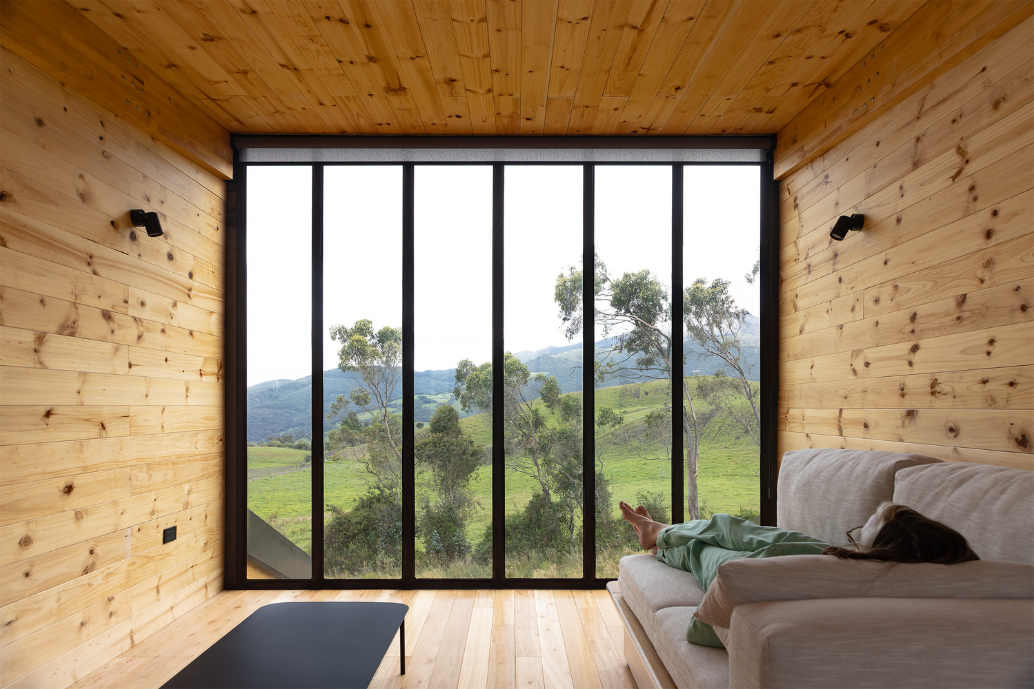 El diseño de Taller General distribuye los espacios en dos niveles: el superior, destinado a la vida diaria de la pareja que la habita, y el inferior, activado para recibir visitas. La casa se sostiene sobre costillas de madera moduladas cada 2,44 metros, adaptadas al relieve y al clima de alta montaña, y reforzadas con piezas metálicas en las zonas más expuestas.