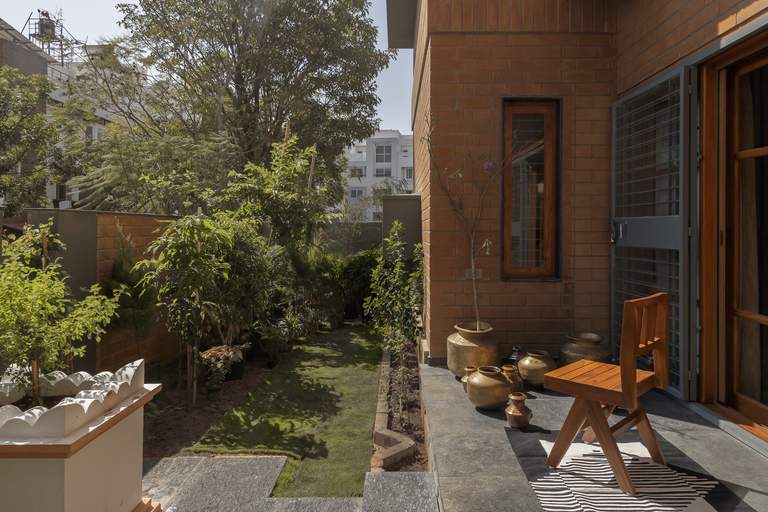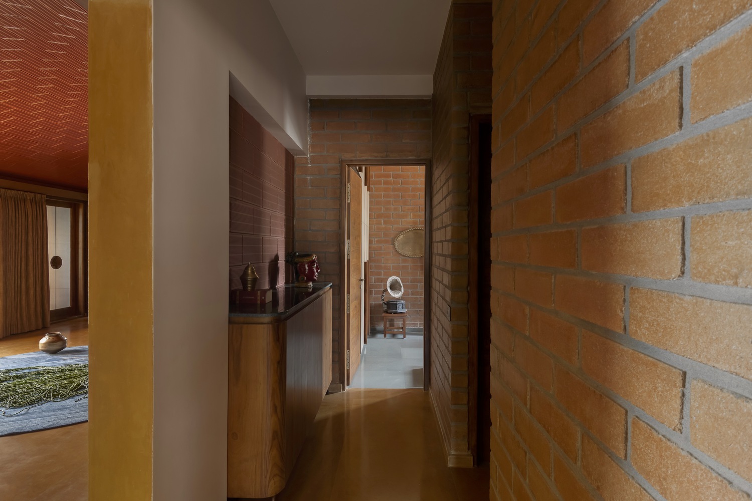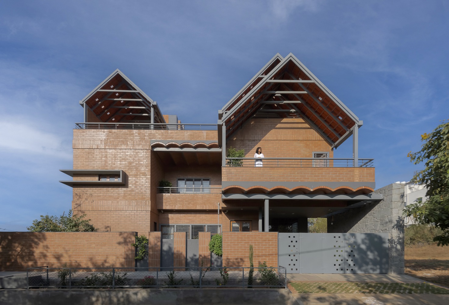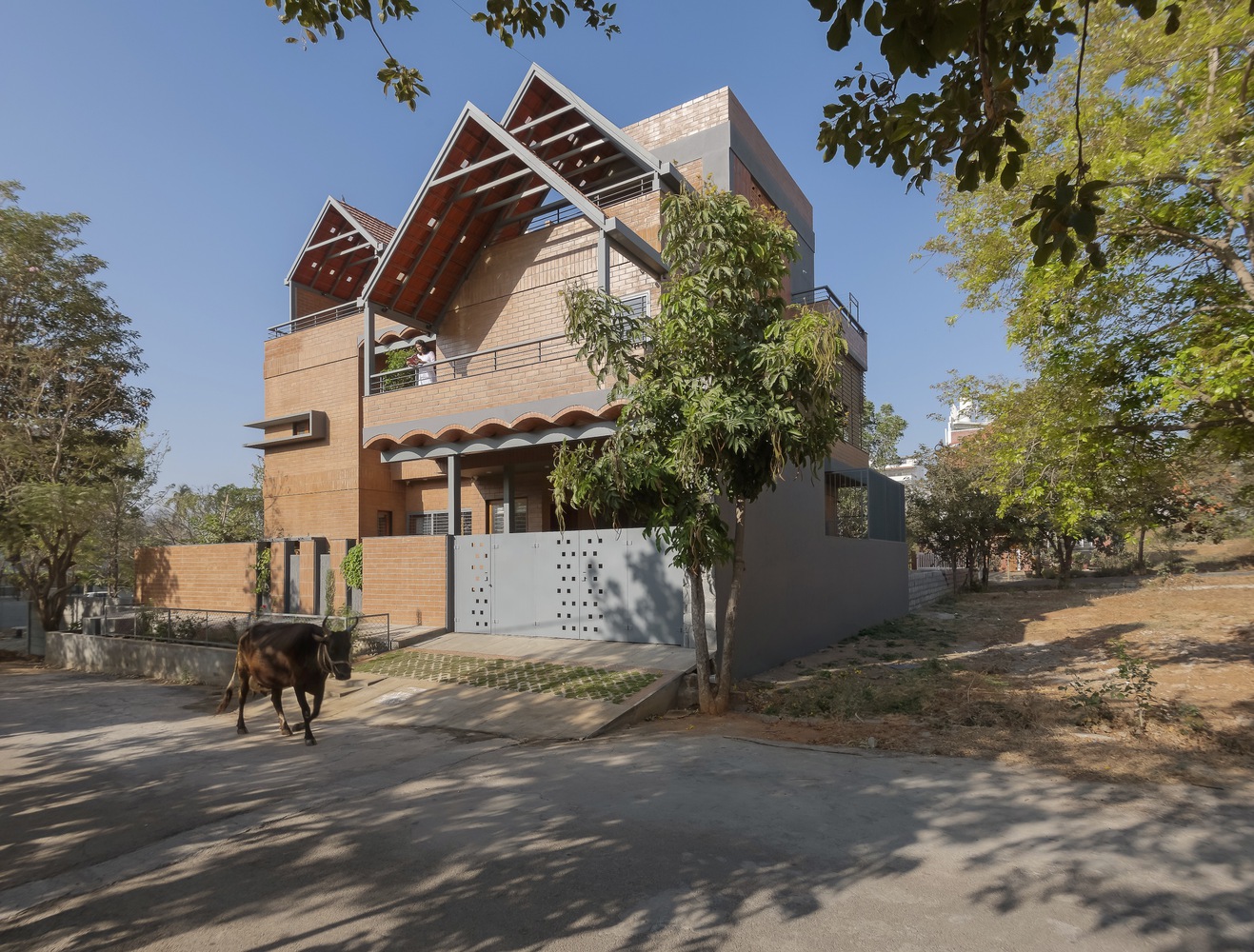 Madhura es una casa que conecta generaciones, diseñada para dos hermanos que buscaban revivir la esencia de su hogar ancestral en Kampli, Karnataka, en medio del vibrante contexto urbano de Bengaluru. Con dos casas apiladas y organizadas según el Vastu Shastra, ofrece privacidad e independencia, pero con espacios comunes que fomentan la convivencia y las reuniones familiares. Construida con materiales sostenibles como barro, piedra y bloques de terracota, la casa recrea el ambiente cálido de las viviendas tradicionales, minimizando la huella de carbono. Los patios y terrazas permiten la conexión constante con la naturaleza, mientras que los juegos de luz y sombra añaden dinamismo. El tercer nivel es un refugio de esparcimiento con una terraza verde, un cine al aire libre y un gimnasio. Por otro lado, las curvas de los arcos y los techos inclinados aportan un diseño vibrante, mientras que los colores terrosos y una pared de óxido amarillo celebran la rica herencia de la familia.