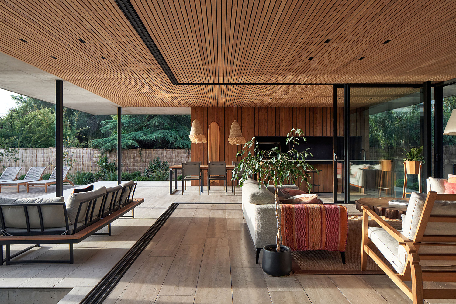 Definido por las condiciones intrínsecas del terreno, este proyecto residencial en Chicureo traduce geografía, clima y paisaje en una estrategia arquitectónica precisa. La parcela —larga, plana y orientada de este a oeste— ofrece una continuidad visual excepcional entre la Cordillera de los Andes y la Cordillera de la Costa, condición que se potencia mediante un volumen central completamente transparente donde se concentran los espacios comunes, permitiendo vistas abiertas y una ventilación cruzada natural impulsada por las brisas del suroeste. El programa se organiza linealmente a lo largo del borde sur, con dormitorios orientados al norte para optimizar la ganancia solar, configurando una planta en forma de T que divide el jardín en dos áreas diferenciadas. Esta disposición no solo ordena el habitar, sino que refuerza la relación entre interior y exterior, utilizando el volumen acristalado como articulador espacial y climático del conjunto. El confort térmico se aborda desde el diseño pasivo: un sistema de cubierta con amplios voladizos protege las fachadas, mientras una losa de hormigón aporta inercia térmica. Sobre ella, un techo liviano genera un ático ventilado perimetralmente mediante celosías, disipando el calor acumulado y evitando el sobrecalentamiento. Lamas de madera fijas y operables complementan el control solar cuando el sol incide en ángulos bajos, consolidando una vivienda que responde al clima desde la arquitectura, sin recurrir a soluciones mecánicas intensivas.