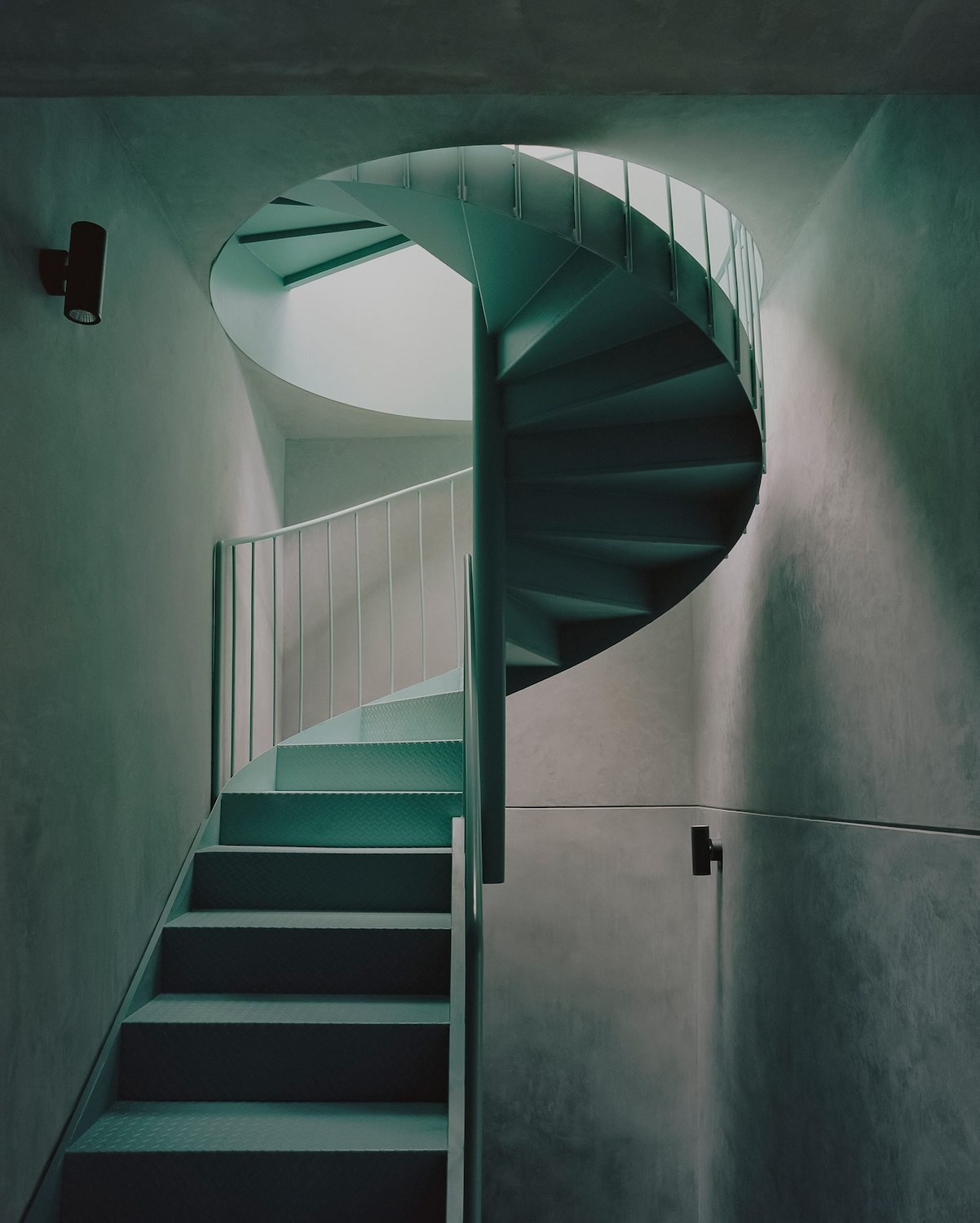 Una escalera de caracol color verde azulado se convierte en el eje narrativo que guía el recorrido entre niveles, conectando el pasado con la vida contemporánea. La remodelación respeta la estructura existente, pero introduce gestos audaces: un tragaluz cilíndrico y múltiples fuentes de iluminación cenital inundan de luz el interior, generando contrastes que intensifican la atmósfera íntima de los espacios inferiores.