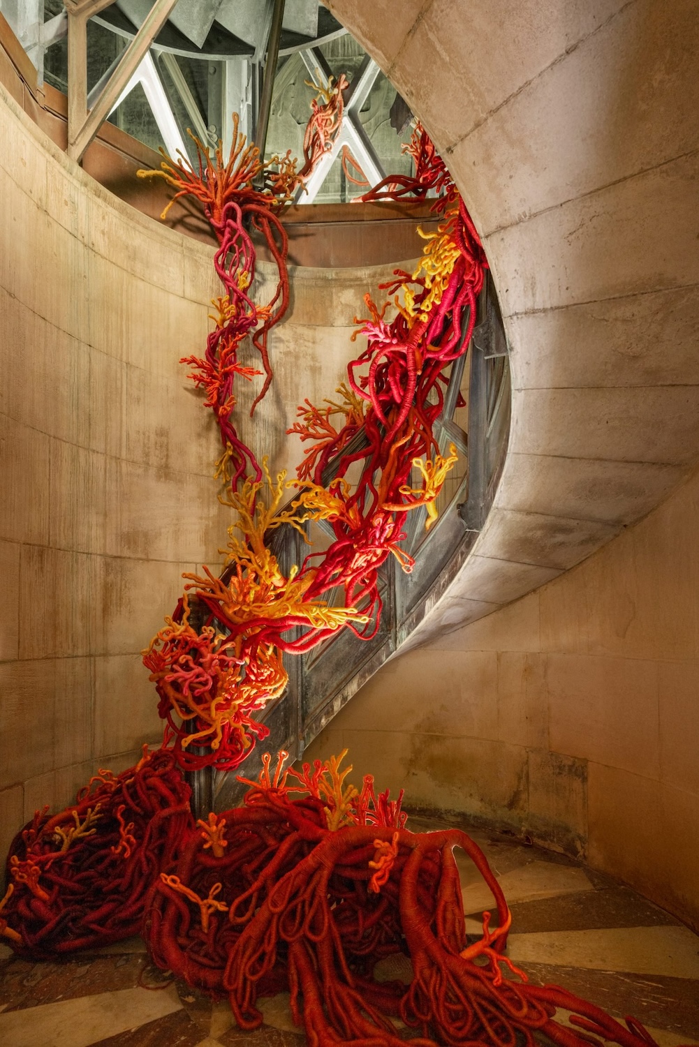 El gradiente cromático, que transita del blanco al rojo intenso, refuerza la metáfora de transformación y resiliencia, mientras la textura densa pero flexible de las piezas aporta una energía ascendente que parece insuflar vida al espacio.
