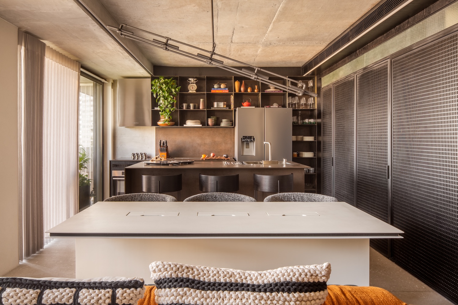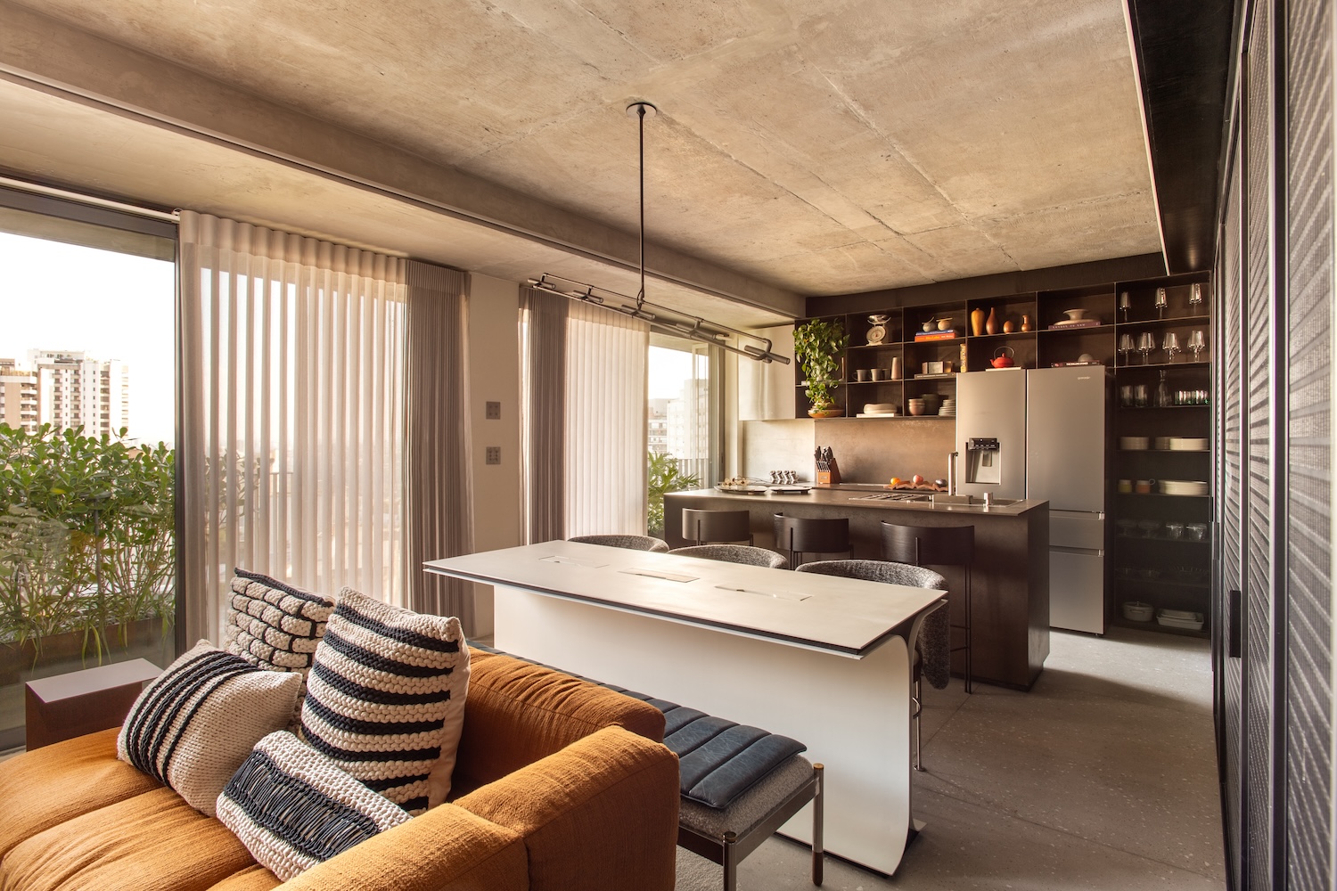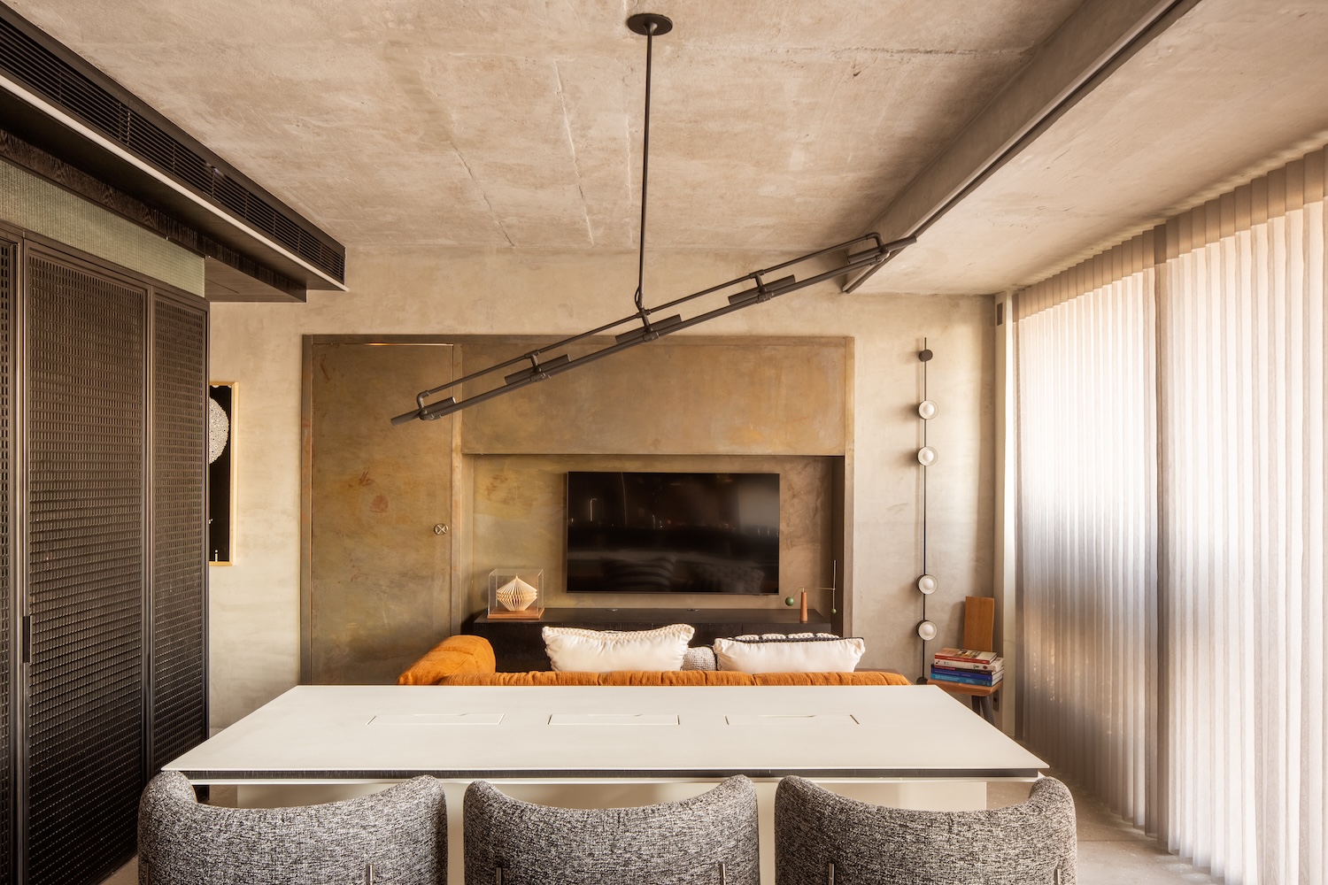 La iluminación refuerza esa claridad: líneas embebidas en el concreto guían la mirada y subrayan la precisión del trazo, mientras lámparas colgantes y apliques introducen matices más íntimos. Cada rincón asume más de una función, sin cargar el ambiente. La mesa que separa la cocina del estar, por ejemplo, sirve también como escritorio sin dejar de ser pieza central.