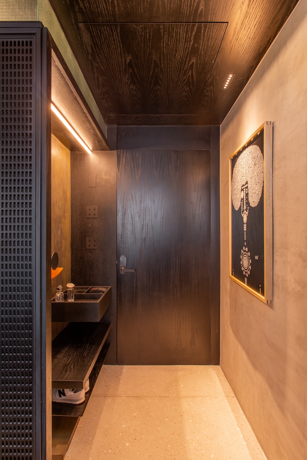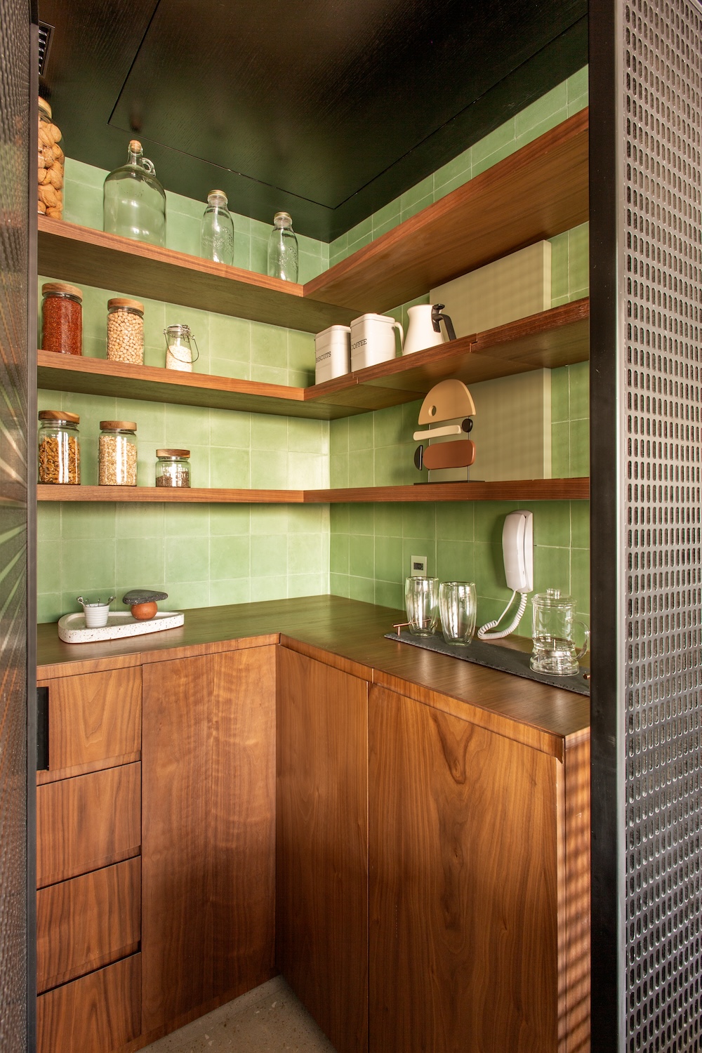 Los materiales dialogan por contraste: metal oxidado, superficies negras, grises suaves, y un contrapunto de texturas artesanales como el azulejo hidráulico verde en la lavandería. Todo se articula con una lógica de integración, desde los paneles perforados hasta la carpintería que oculta instalaciones sin romper el ritmo del conjunto.