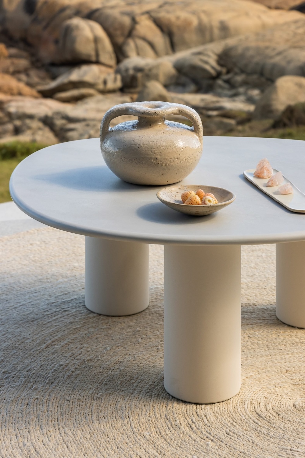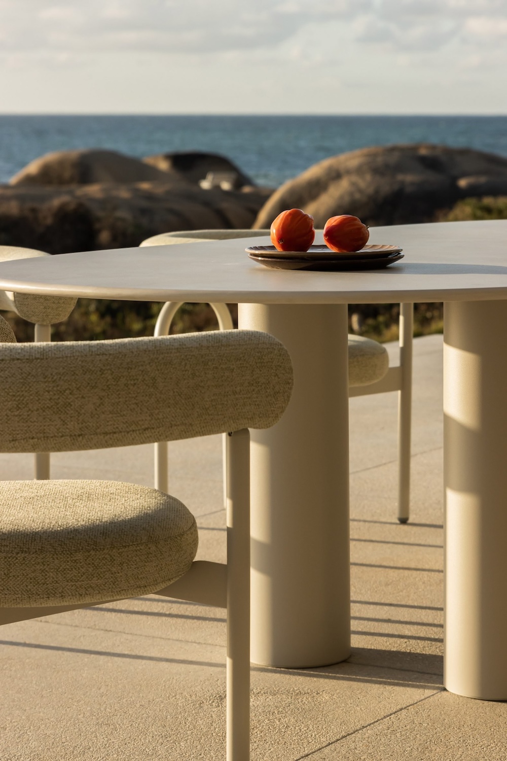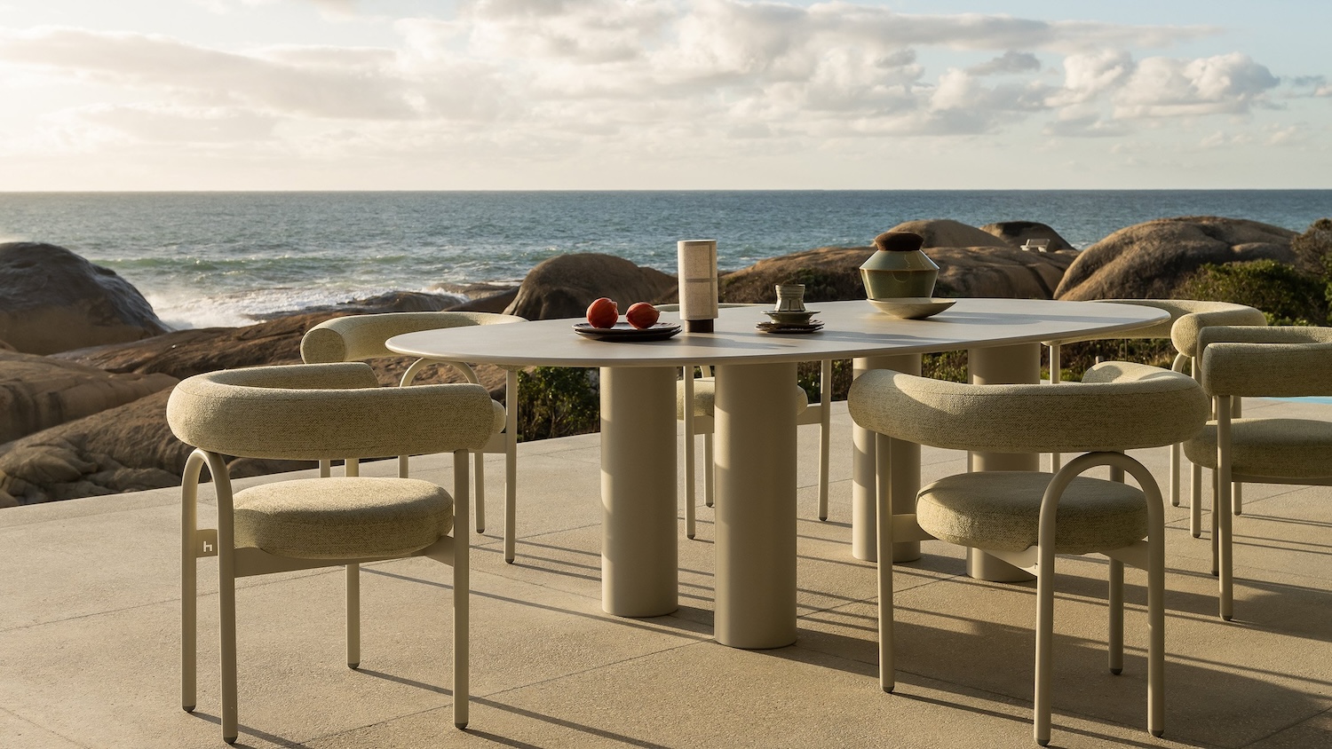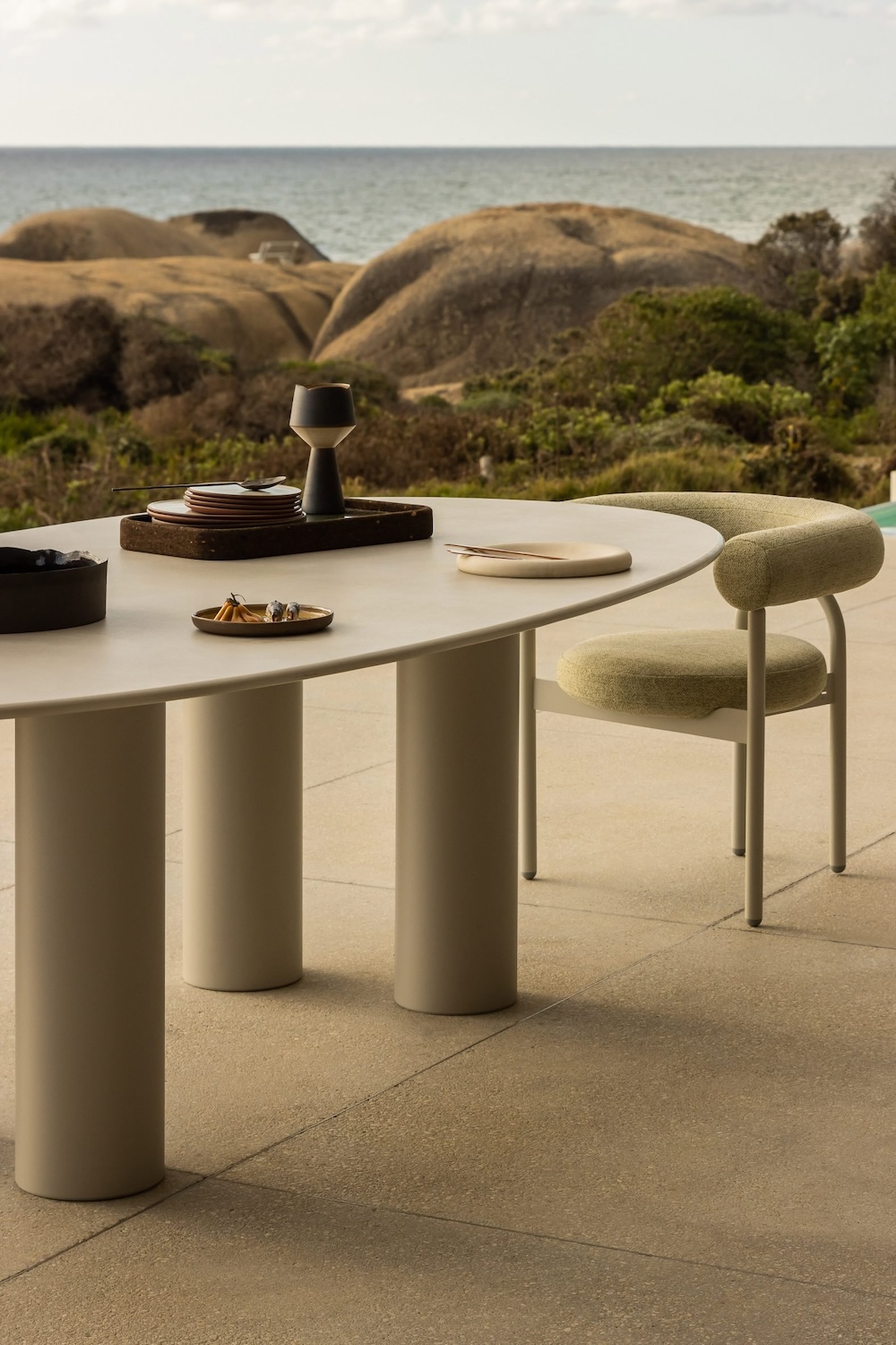El diseñador sudafricano Haldane Martin reinterpreta la mesa como una obra escultórica con Dombolo, una colección que fusiona materiales industriales con formas orgánicas y una fuerte identidad cultural. Inspiradas en las albóndigas regordetas de la cocina Xhosa, estas mesas de exteriores presentan patas robustas de tubos lácteos industriales y superficies de Dekton Kraftizen, evocando la textura del yeso. El resultado es una pieza que desafía la rigidez del acero inoxidable con una estética fluida y relajada, que Martin compara con las células de una ameba. Diseñadas para adaptarse al entorno natural, las mesas Dombolo pueden personalizarse en una paleta de 10 tonos neutros para la tapa y 24 colores vibrantes para las patas, convirtiéndose en una expresión versátil del estilo de vida de Ciudad del Cabo.