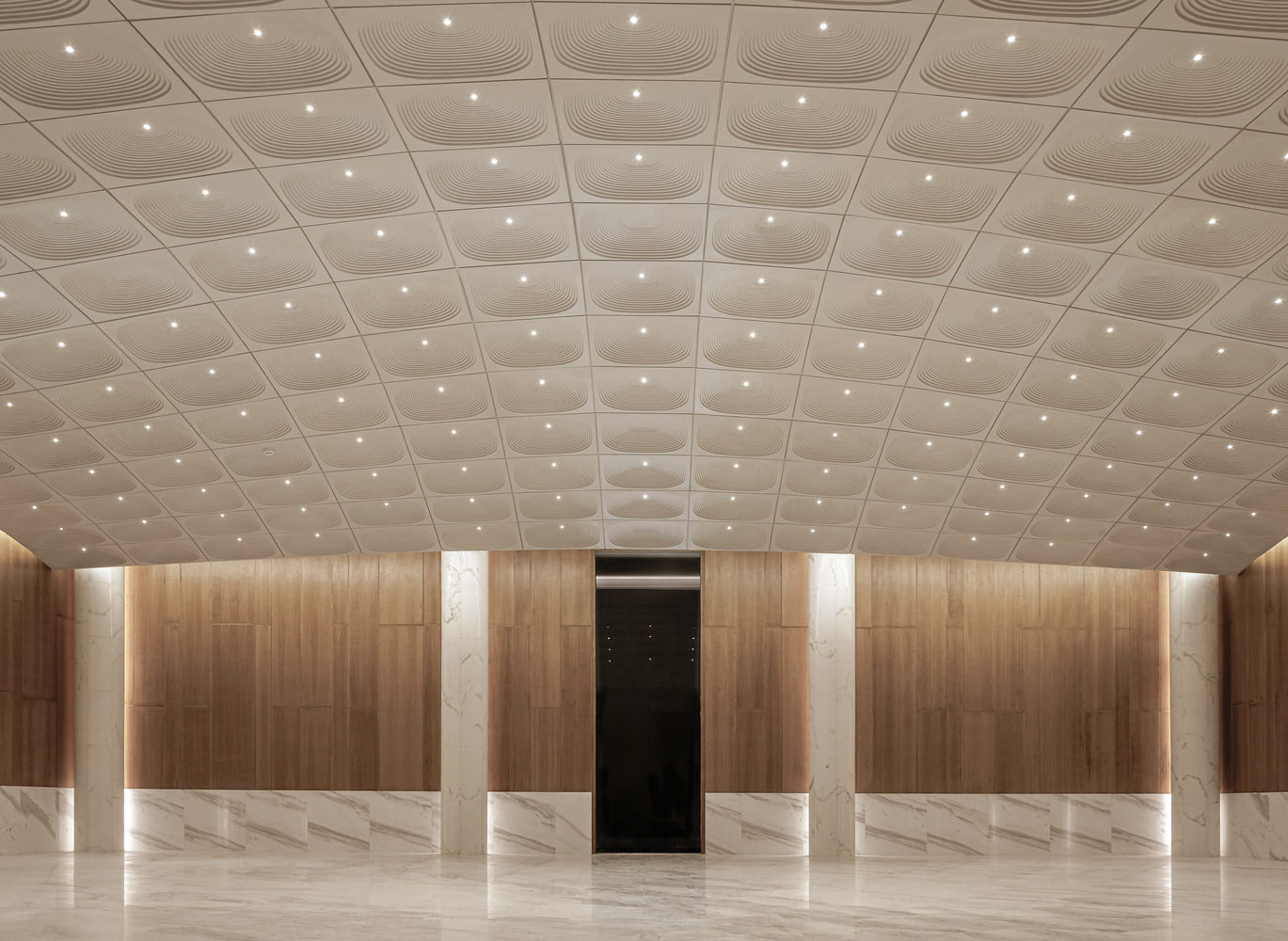 El vestíbulo, bañado por luz natural que filtran listones de madera curvados, marca una entrada ceremonial donde la claridad y la calma reemplazan la rigidez institucional. El corazón del edificio, la Sala de Recepción, despliega un techo esculpido en polímero, cuyas ondas táctiles y lumínicas se comportan como una instalación artística permanente: acústica, funcional, envolvente.