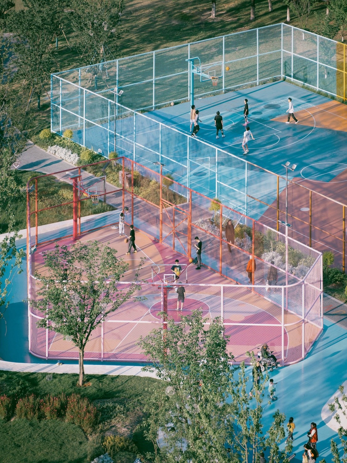 El corazón visual del parque es una escultural “cinta blanca” de hormigón UHPC que conforma el skatepark, combinando resistencia estructural con una sensación de ligereza coherente con el concepto original. Esta pieza central dialoga con una paleta cromática dinámica —azules, naranjas y rosas— aplicada a las áreas deportivas, logrando un equilibrio entre vitalidad y contención que activa el espacio sin saturarlo.