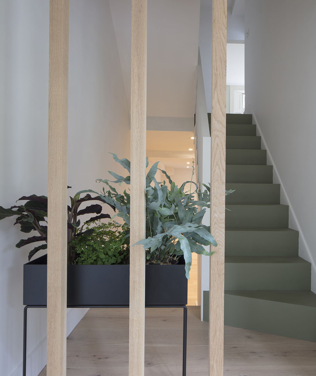 El estudio Architecture for London reformó una pequeña residencia construida al alero de una antigua casa victoriana ubicada al norte de la ciudad, añadiendo nuevos espacios y una estética contemporánea. Las áreas de cocina, comedor y estudio están definidas de manera informal por postes y vigas expuestas de roble que permiten que la luz natural penetre profundamente en el plano de la planta baja; adicionalmente, estos elementos enmarcan las vistas y dirigen el ojo hacia el exuberante fondo verde del exterior. Una cuadrícula ortogonal recorre la propiedad con ladrillos en una variedad de enlaces externos, y baldosas cuadradas con líneas de color en contraste en la cocina y el baño. Este enfoque geométrico contrasta con los detalles victorianos tradicionales que fueron restaurados en el piso superior y entre los que destaca la mantención de los ladrillos del muro trasero y el uso de vidrio acanalado para reducir el impacto de la escalera exterior.