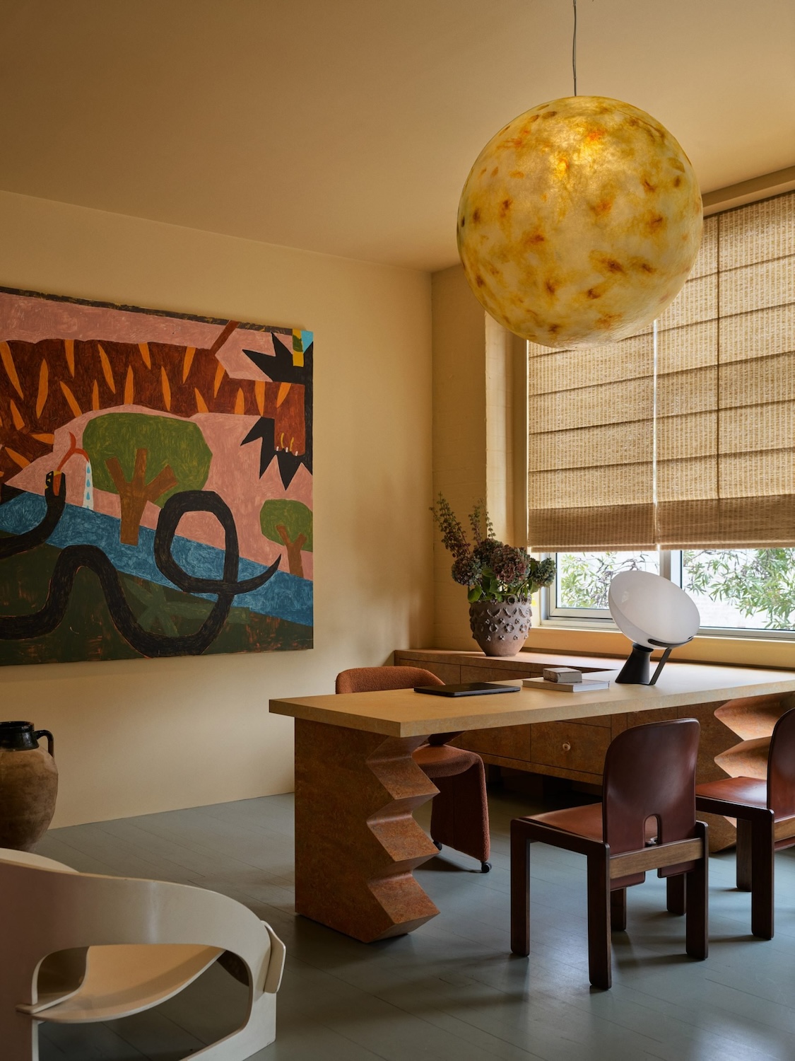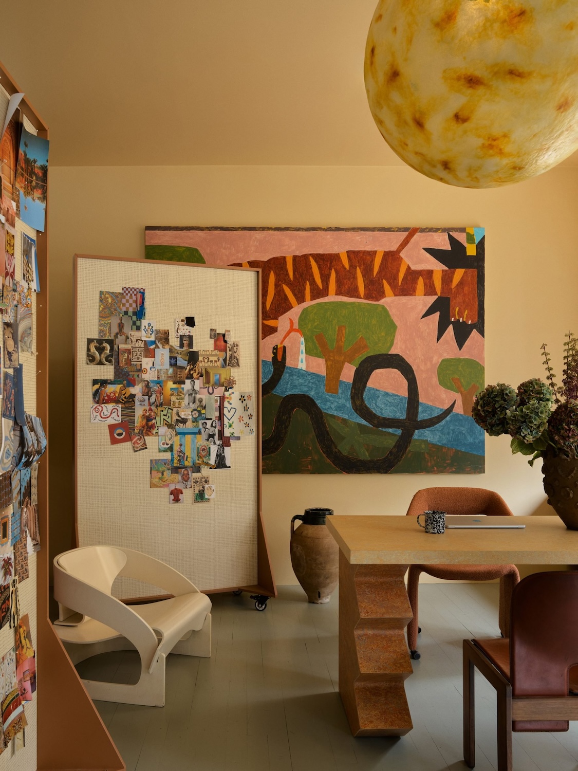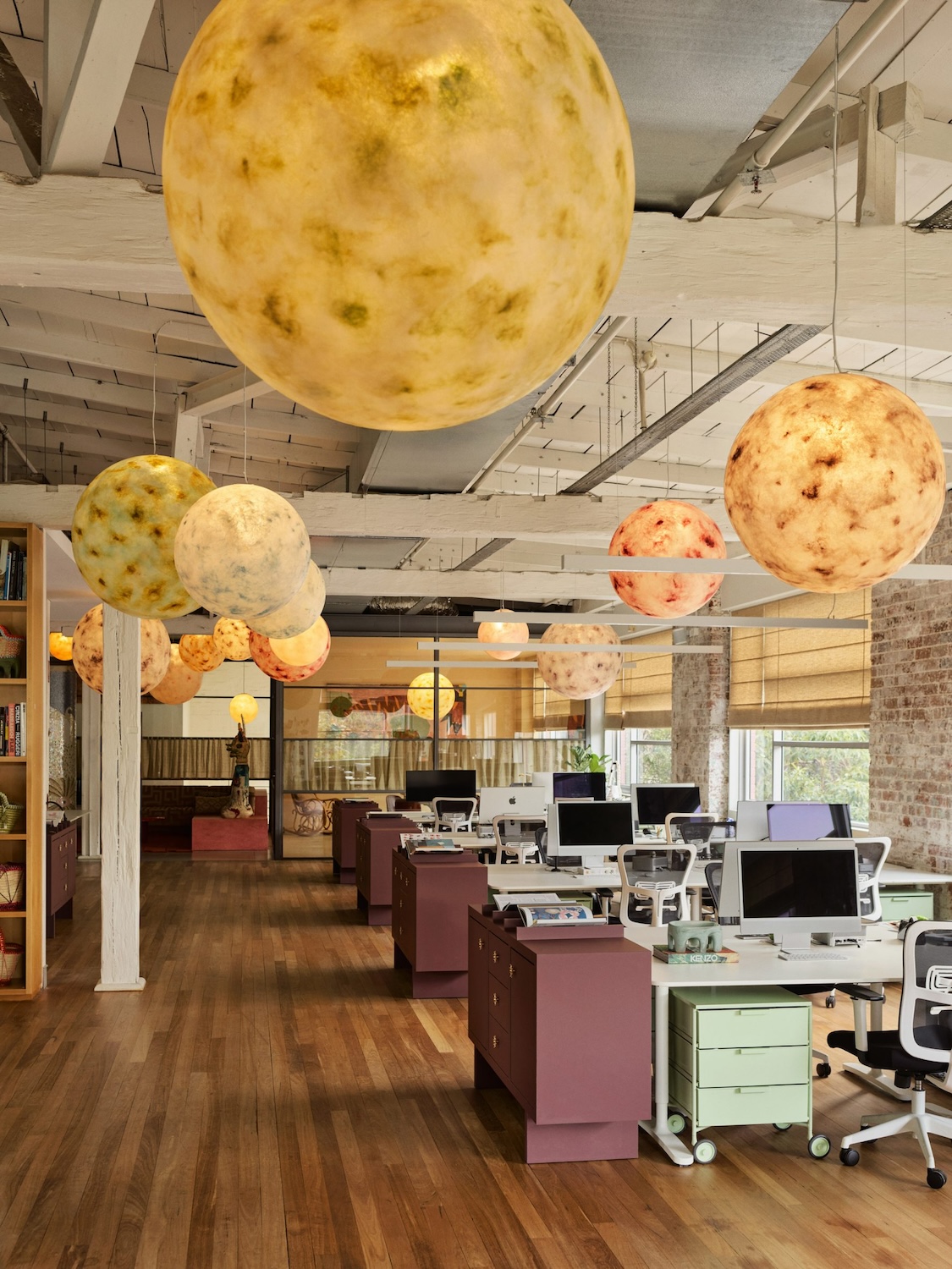 La oficina combina funcionalidad y fantasía con espacios de trabajo comunes, oficinas privadas y una cocina abierta que también funciona como área de reuniones. Colores estratégicos —menta, ciruela y acentos intensos— delimitan zonas, mientras que piezas personalizadas, como la mesa “ojo” pintada a mano, refuerzan el carácter lúdico del lugar.