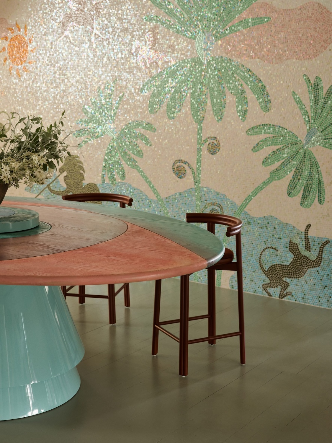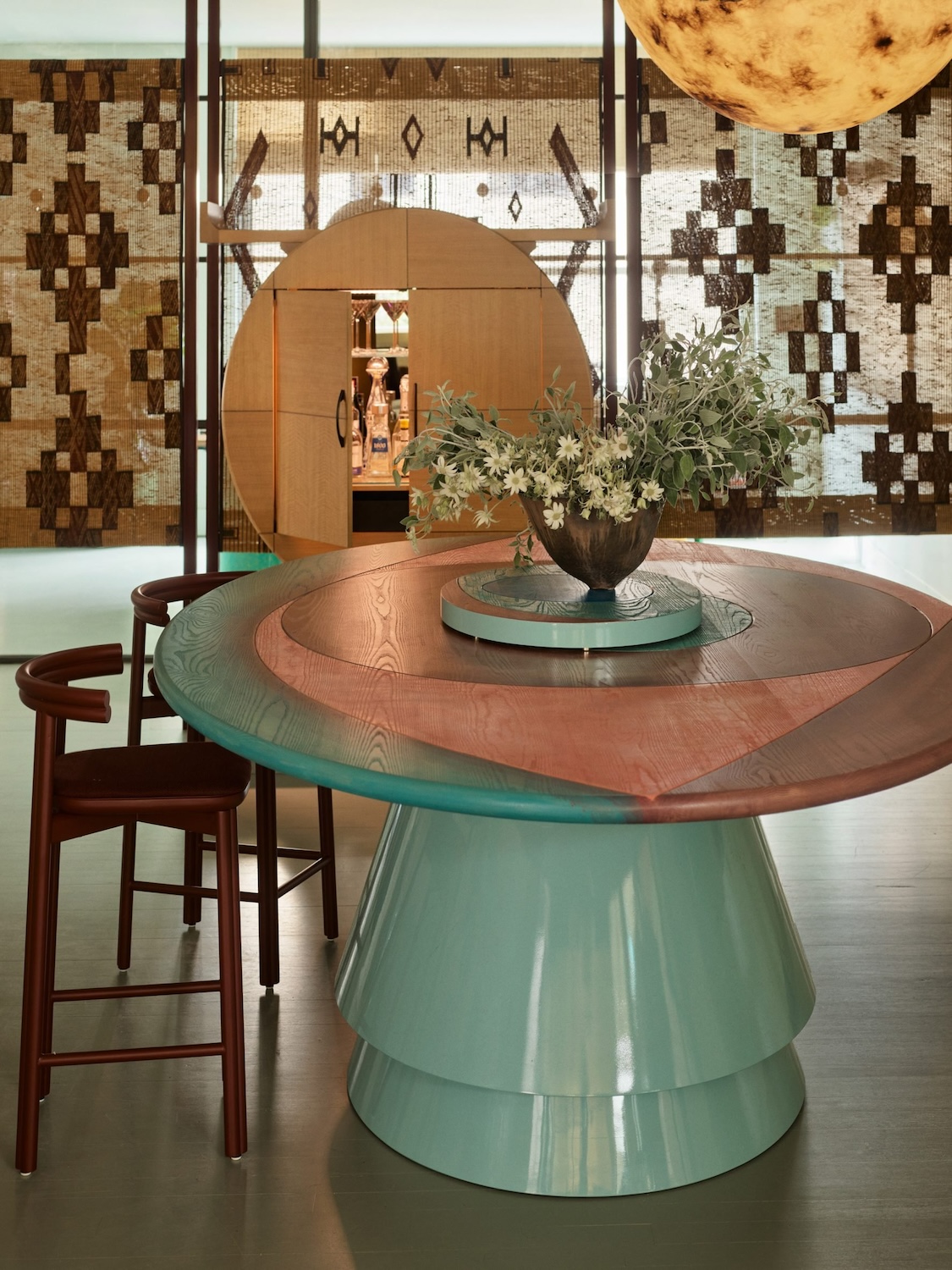 Banquetas tapizadas con textiles vibrantes y marcos móviles para moodboards fomentan la creatividad y la adaptabilidad cotidiana. El uso de materiales táctiles como mosaicos de vidrio, mármol Calacatta Viola, bronce o terciopelo aporta sofisticación a un entorno diseñado para estimular la imaginación.