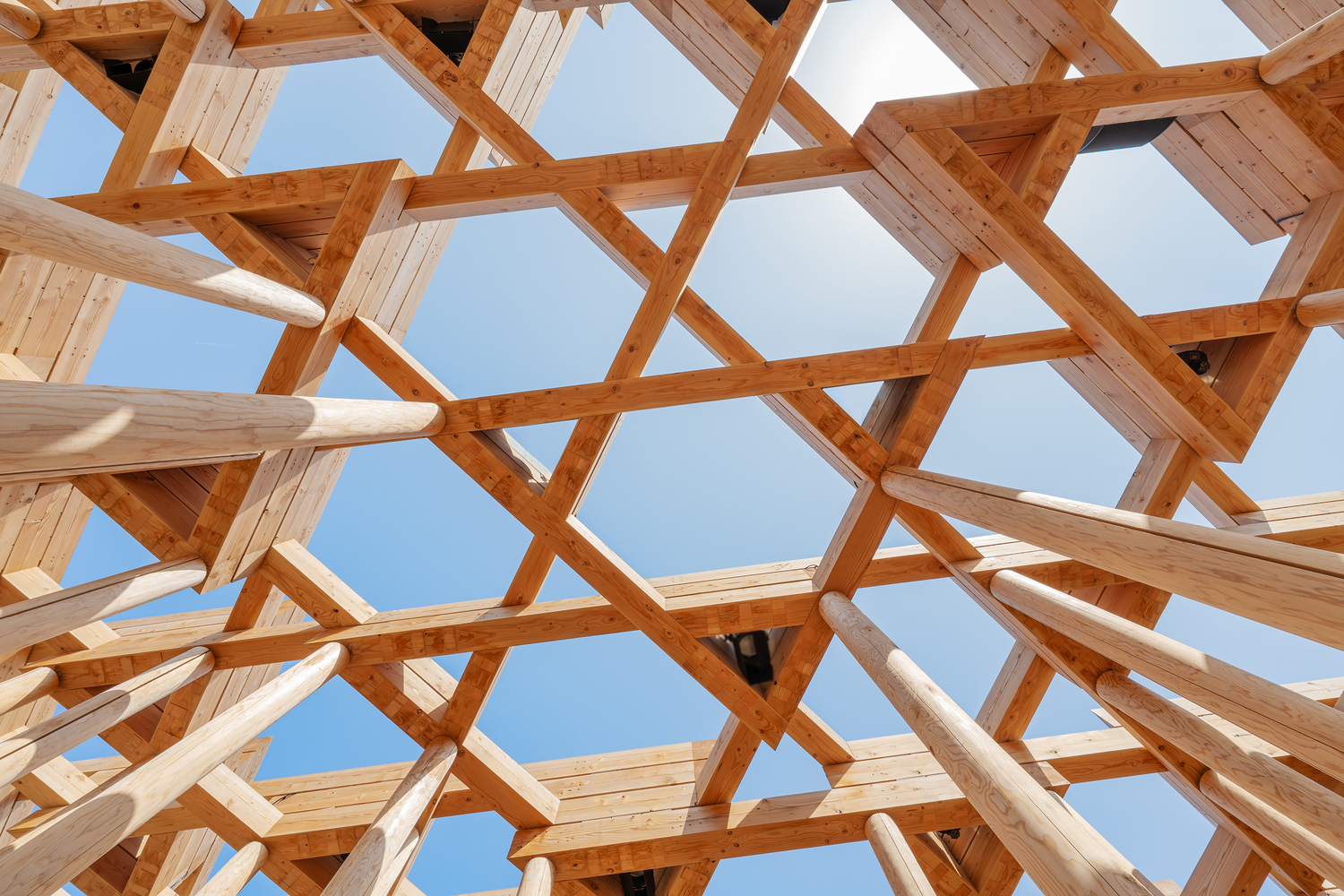 El concepto se organiza en torno a la metáfora del crecimiento. Desde una base compacta de arcilla, ladrillo y acabados de tierra que remite a tradiciones constructivas locales y optimiza la inercia térmica, el visitante asciende hacia una terraza abierta concebida como un bosque elevado. El recorrido vertical, acompañado por una proyección multimedia de 360 grados, convierte el desplazamiento en experiencia sensorial y conduce desde un espacio introspectivo hacia un plano permeable y luminoso, donde la madera japonesa configura una retícula de columnas y pérgolas.