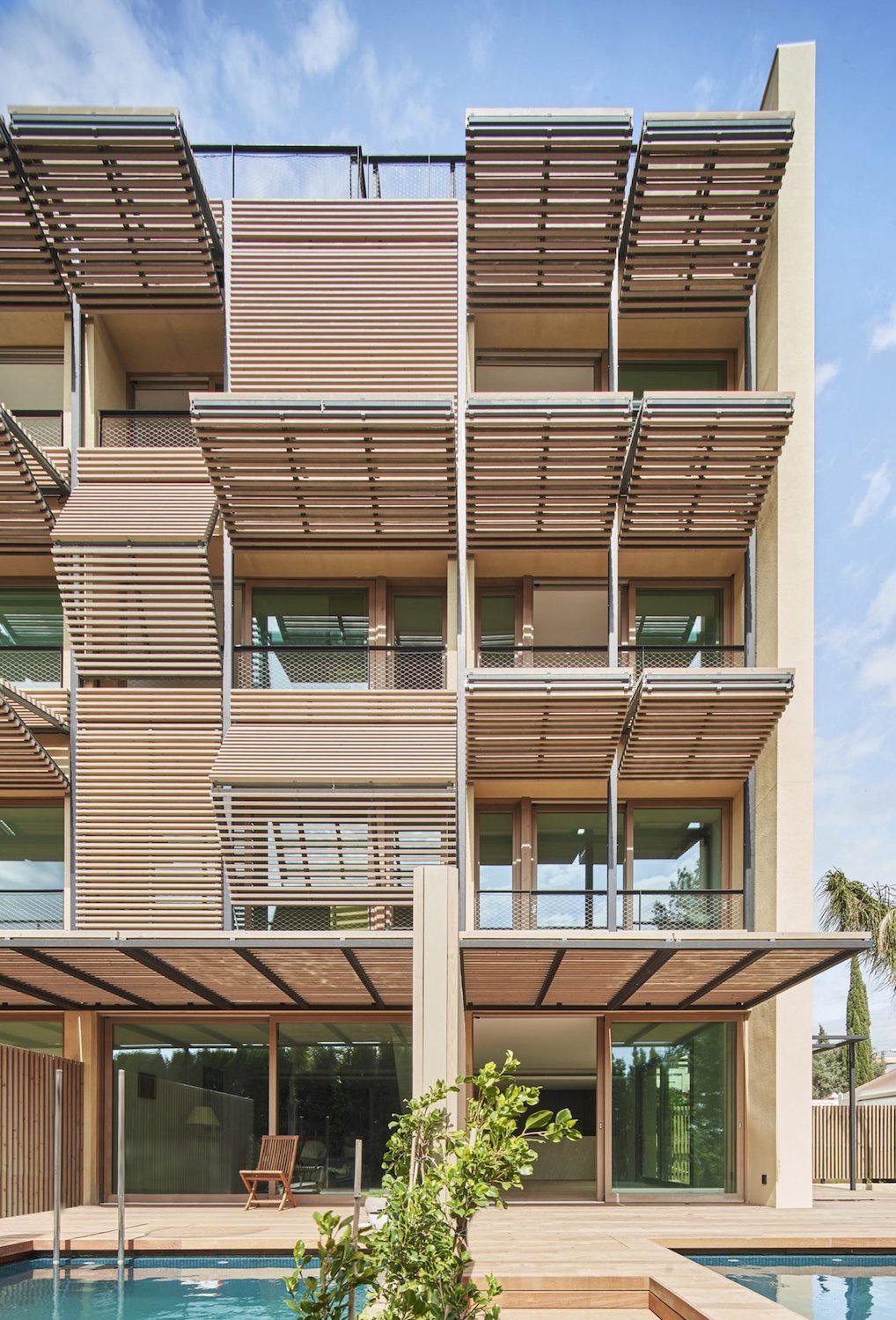 Paral·lel es un complejo residencial desarrollado por la firma española OHLAB, que se caracteriza por su fachada de madera perforada y sus jardines interiores. Ubicado en el tranquilo barrio residencial de Bonanova, Palma de Mallorca, este proyecto contiene un total de 12 departamentos dúplex que se dividen en seis unidades de planta baja coronadas por seis unidades de ático. Su aspecto más llamativo recae en las persianas móviles que se instalaron en las fachadas delanteras y traseras con el fin de controlar la ventilación de los espacios y la optimización de luz solar en los mismos.