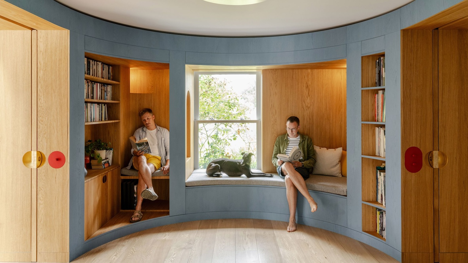 El centro de la casa lo ocupa una biblioteca revestida íntegramente en roble, concebida como un volumen curvo que incorpora nichos de lectura y espacios de reunión. Desde este núcleo, los interiores se despliegan hacia la cocina y el comedor, donde una paleta de colores primarios se aplica con precisión según los materiales. Azules profundos, amarillos intensos y acentos rojos construyen una identidad lúdica pero contenida, lejos de lo decorativo.
