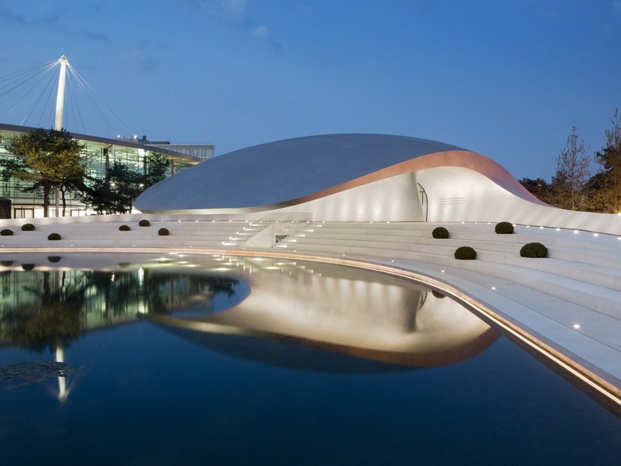 El parque temático en Autostadt —el centro de atracciones de la fábrica de Volkswagen en Alemania— inauguró su primer edificio en más de una década con Porsche Pavilion, ganador de un premio del Consejo Alemán de Diseño en categoría de arquitectura. Celebrando la importancia de esta rama de Volkswagen, el edificio—que pareciera ser hecho únicamente de una pieza—refleja la imagen tradicional del famoso automóvil: suavidad, fluidez, ligereza, innovación y una superficie—de acero inoxidable—totalmente lisa. El techo curvo que cubre la entrada al recinto subterráneo emula la velocidad del auto Porsche, pero su terminación, suave y por sobre una laguna, pretende reflejar también la seguridad y el control que ofrece el mismo. Al interior del pabellón, un auditorio y una sala de exhibiciones sobre la historia de la marca reciben al público.