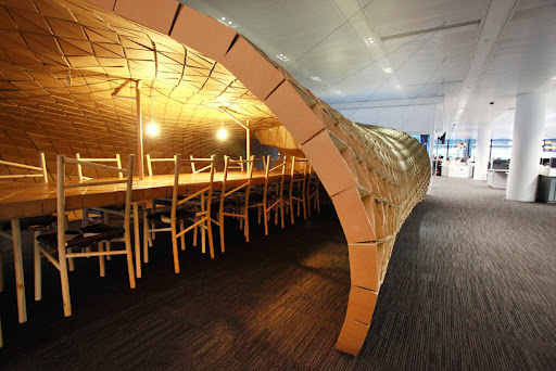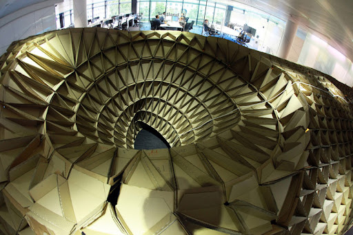 La paciencia de pájaros e insectos a la hora de construir su refugio a partir de elementos naturales ha inspirado el diseño de Pupa, un pabellón proyectado por Liam Hopkins y su estudio Lazerian. Comisionado por la agencia de información Bloomberg, la estructura reaprovecha los deshechos generados por la empresa en su sede de Londres. Fue construido en secciones triangulares, tomando las propiedades estructurales y acústicas del cartón. Se utilizaron técnicas de modelado por computador para general la forma y los componentes individuales fueron extraídos a partir del diseño virtual para crear layouts planos que se pegaron cada uno a mano.