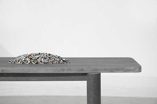 Los muebles se ven como si fuesen de sólida madera rústica, pero realmente son fabricados de plástico reciclado. El diseñador francés Julien Renault descubrió una compañia belga que se especializa en la fabricación de tablas hechas con granulado de plástico reciclado. Mezclada con colorantes, esta composición se funde en una masa homogénea a altas temperaturas y es rociada en moldes. Luego, las tablas son automáticamente expulsadas. Los tablones a prueba de agua de una longitud estándar de 3.6 metros se utilizan normalmente para terrazas, mobiliario urbano y mobiliario para exteriores, y pueden ser procesados como tablas de madera maciza. Renault quería ampliar la gama de muebles que se pueden utilizar tanto en interiores como en exteriores. Su colección para el aire libre consiste en una mesa, banco y sillas, todas ellas muy bajas. El diseño de aspecto arcaico está pensado para llevar al usuario más cerca del suelo y por lo tanto también más cerca de la naturaleza: los muebles de plástico sólido pueden ser fundidos y reprocesados una y otra vez después de su uso.