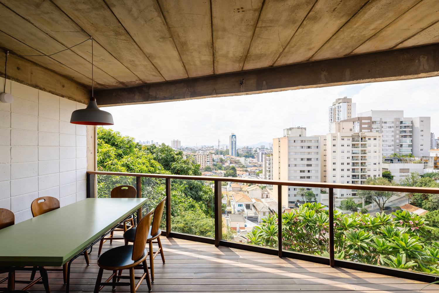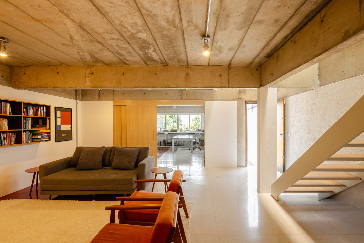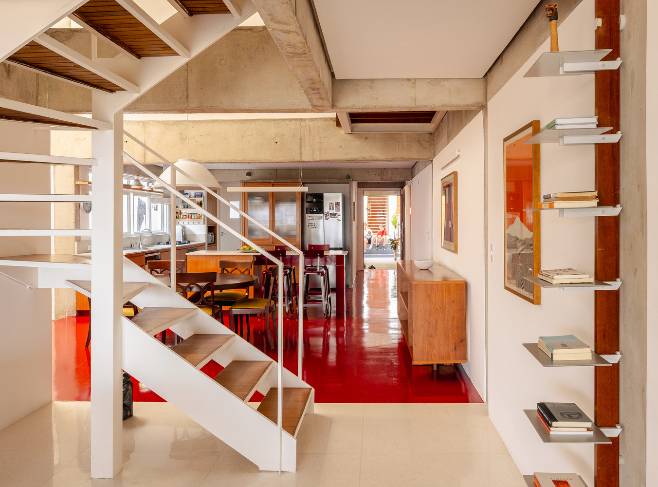 En el barrio de Sumaré, esta reforma residencial reinterpreta una casa de impronta brutalista a través de una estrategia precisa: intervenir sin borrar. La preexistencia —definida por concreto aparente, granilite y ladrillo— se mantiene como base expresiva, mientras nuevas operaciones buscan intensificar su relación con la luz y el paisaje, particularmente hacia el Pico do Jaraguá. El proyecto se construye a partir de sustracciones estratégicas. La apertura de muros en el nivel social elimina barreras y permite que la luz cenital del comedor a doble altura se expanda hacia cocina y sala, antes fragmentadas. Este gesto no solo amplía visuales, sino que redefine la experiencia espacial. La incorporación de un pavimento continuo de epóxi en las áreas intervenidas establece una lectura clara entre lo existente y lo nuevo, funcionando como un hilo conductor que unifica la intervención. En los niveles inferiores y superiores, las decisiones refuerzan esta lógica: la sustitución de una escalera helicoidal por una de trazos rectos mejora la circulación y permite que la luz descienda libremente, mientras la ampliación de vanos en la suite y en el nivel más bajo enmarca el paisaje como protagonista. La reconfiguración del jardín inferior en un espacio de encuentro con parrilla consolida la apertura total de la vivienda hacia su entorno. Más que una renovación, el proyecto propone una edición arquitectónica que revela el potencial latente de la estructura original.