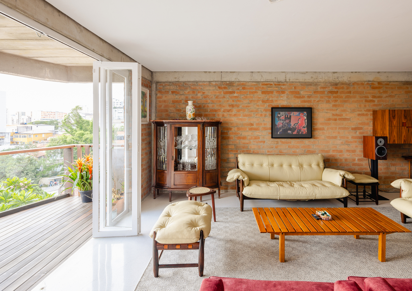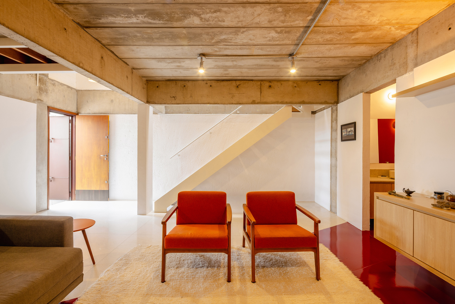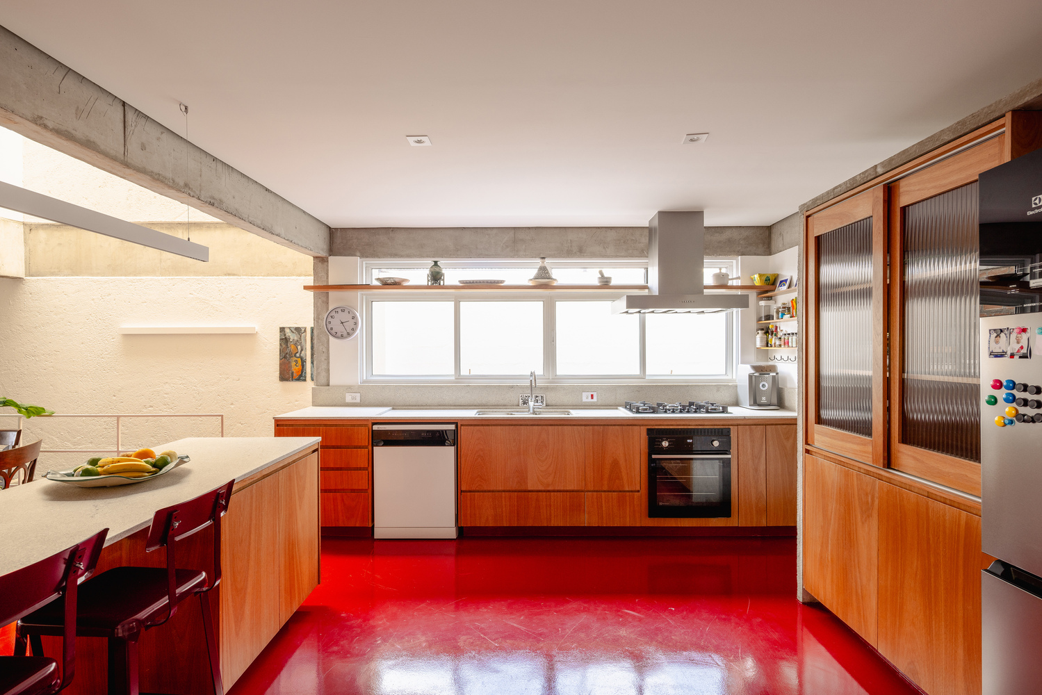 En el barrio de Sumaré, esta reforma residencial reinterpreta una casa de impronta brutalista a través de una estrategia precisa: intervenir sin borrar. La preexistencia —definida por concreto aparente, granilite y ladrillo— se mantiene como base expresiva, mientras nuevas operaciones buscan intensificar su relación con la luz y el paisaje, particularmente hacia el Pico do Jaraguá. El proyecto se construye a partir de sustracciones estratégicas. La apertura de muros en el nivel social elimina barreras y permite que la luz cenital del comedor a doble altura se expanda hacia cocina y sala, antes fragmentadas. Este gesto no solo amplía visuales, sino que redefine la experiencia espacial. La incorporación de un pavimento continuo de epóxi en las áreas intervenidas establece una lectura clara entre lo existente y lo nuevo, funcionando como un hilo conductor que unifica la intervención. En los niveles inferiores y superiores, las decisiones refuerzan esta lógica: la sustitución de una escalera helicoidal por una de trazos rectos mejora la circulación y permite que la luz descienda libremente, mientras la ampliación de vanos en la suite y en el nivel más bajo enmarca el paisaje como protagonista. La reconfiguración del jardín inferior en un espacio de encuentro con parrilla consolida la apertura total de la vivienda hacia su entorno. Más que una renovación, el proyecto propone una edición arquitectónica que revela el potencial latente de la estructura original.