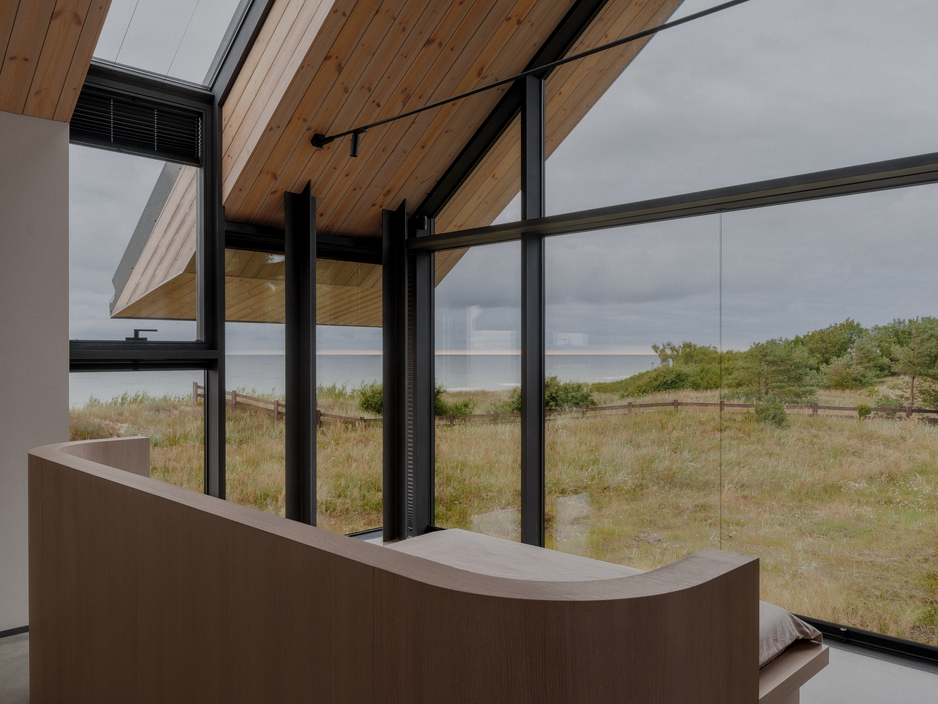 La casa principal se eleva como un puente sobre los cimientos existentes, reduciendo el impacto en el terreno y reforzando su carácter de refugio frente a los intensos vientos del norte. Su pronunciado techo a dos aguas, resuelto con paneles de fibrocemento y una estructura metálica a medida, dialoga con las normativas locales y con la memoria constructiva soviética, mientras una fachada de vidrio continuo abre vistas hacia el horizonte marítimo.