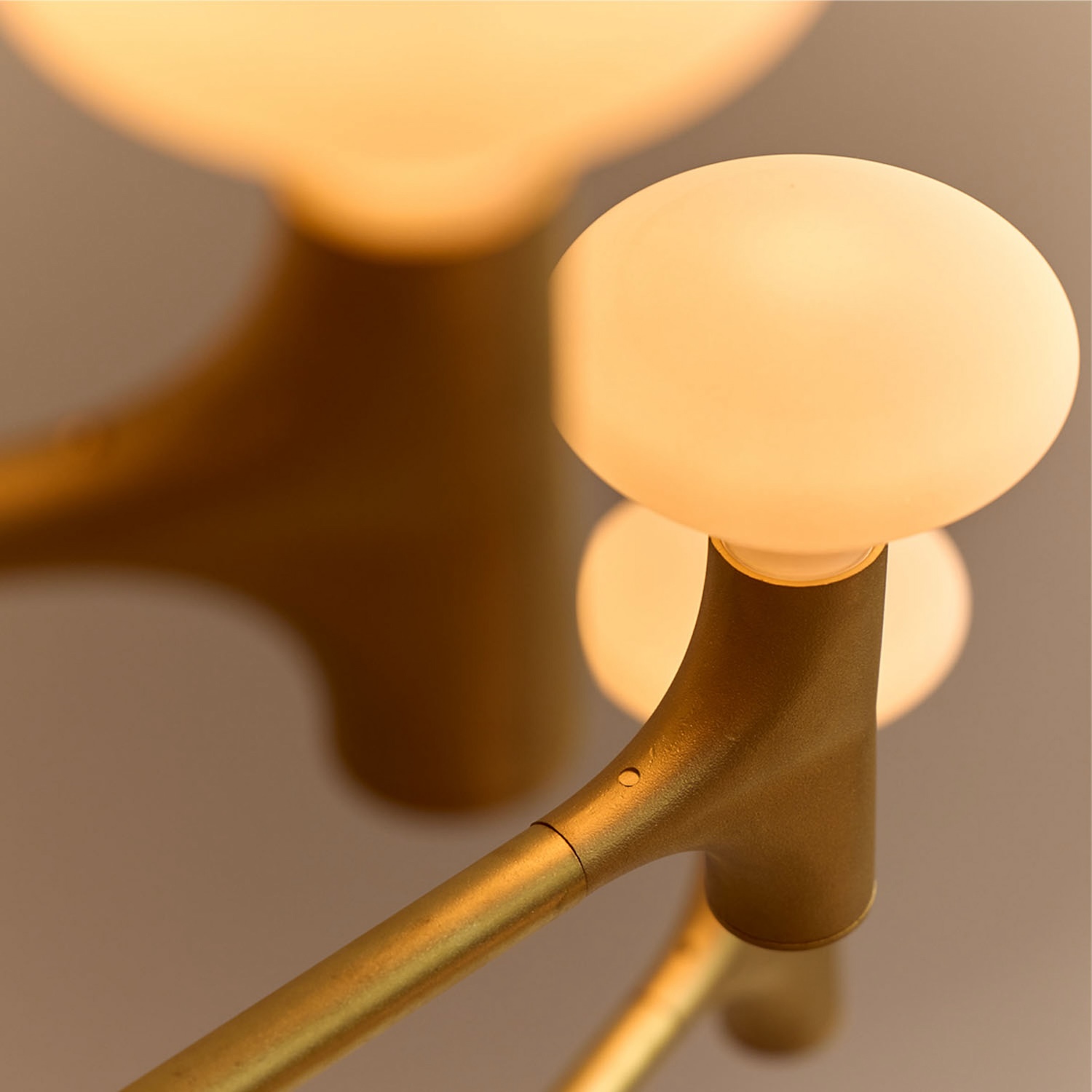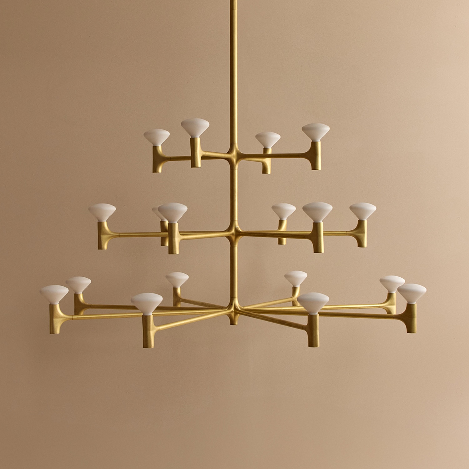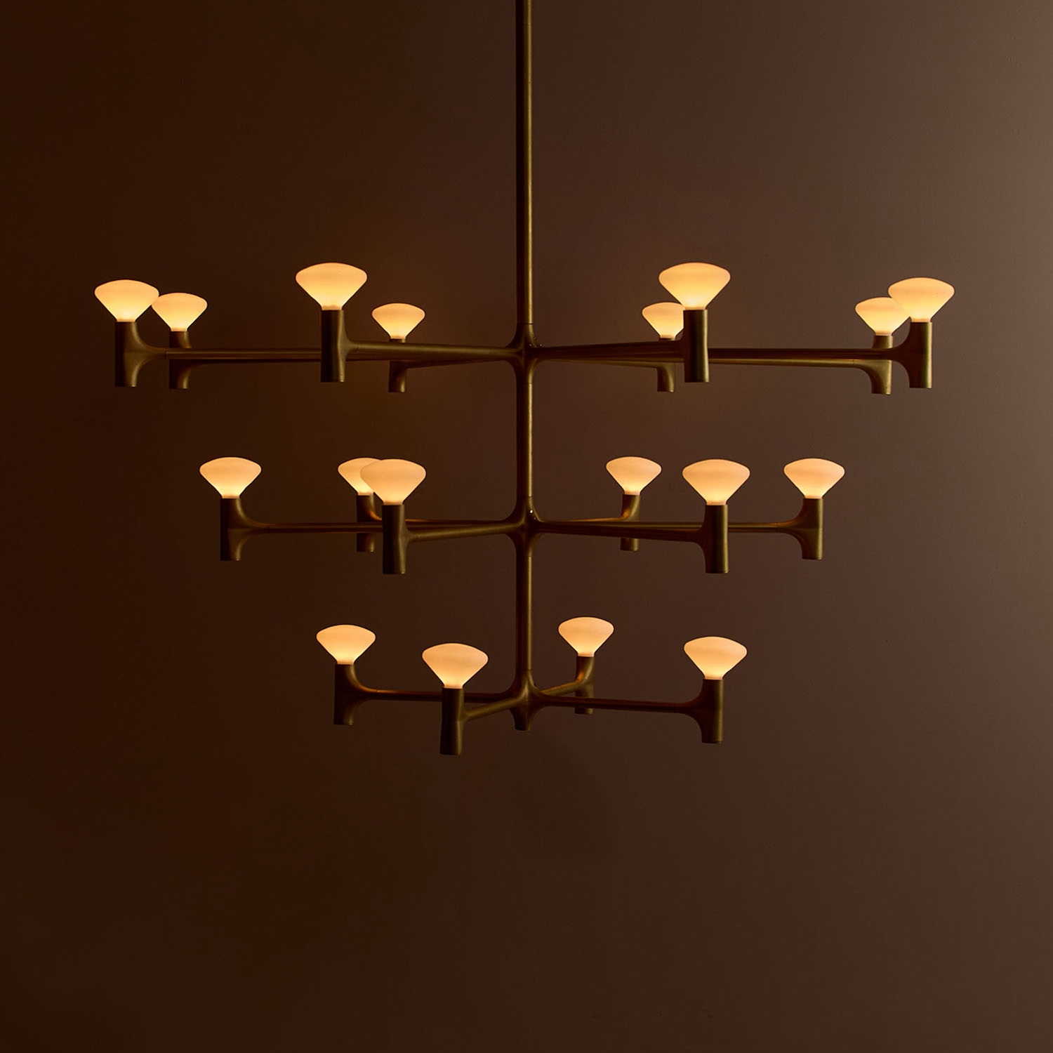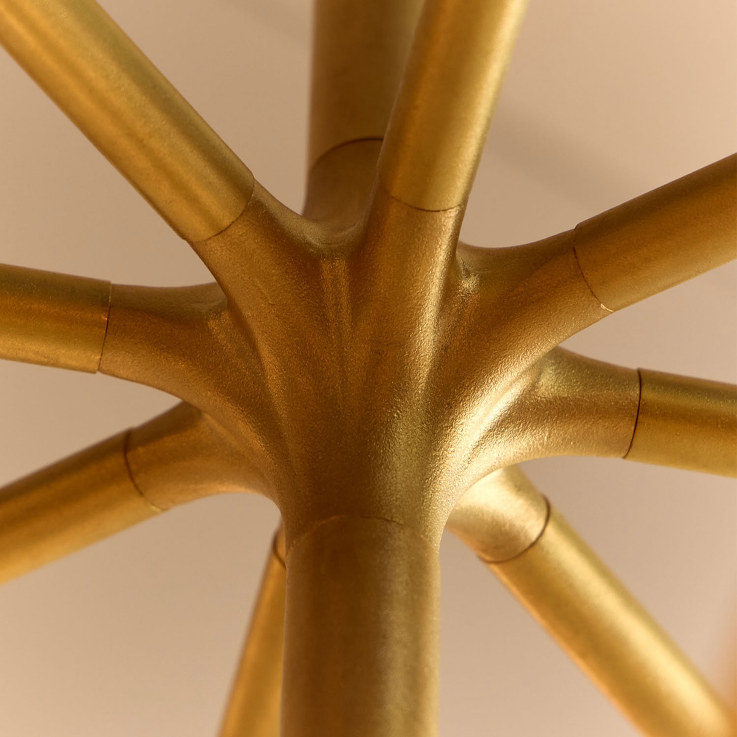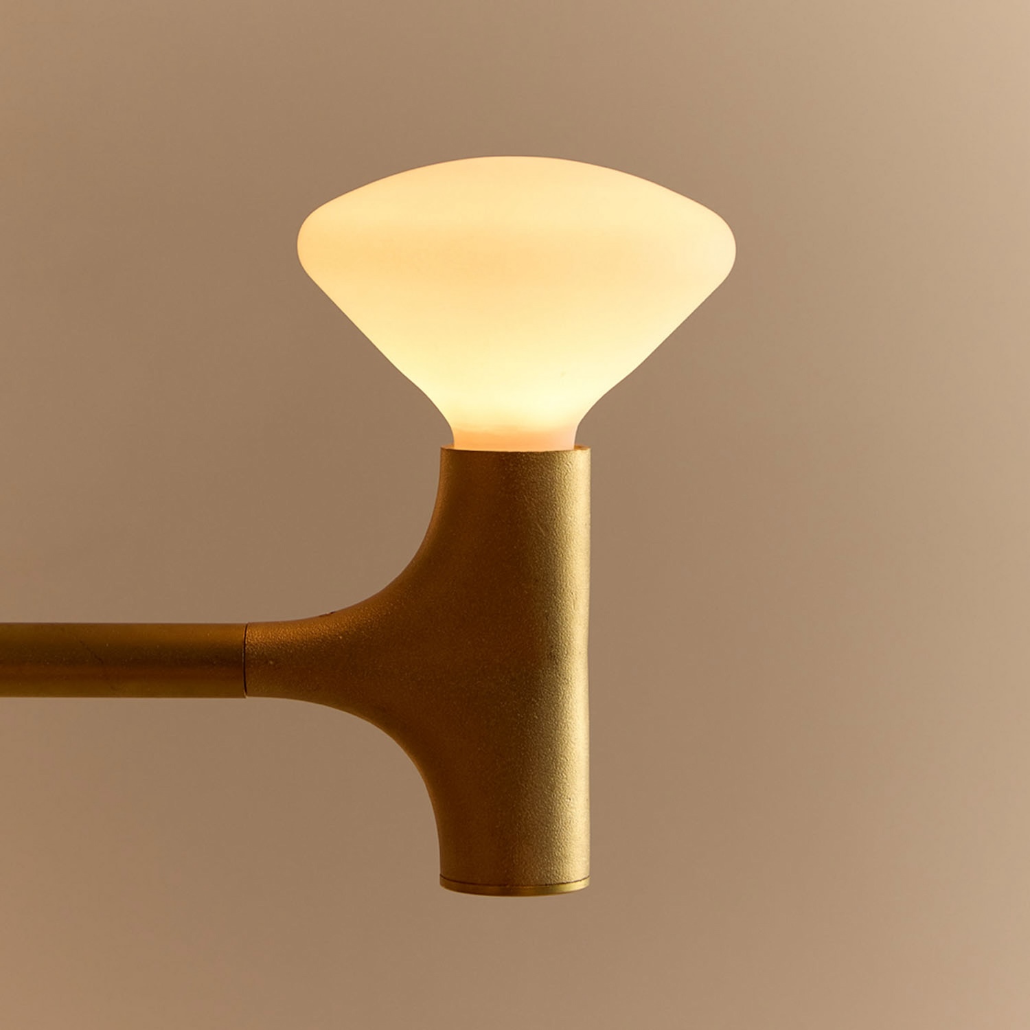 La firma británica Tala traduce los patrones de crecimiento natural en un objeto lumínico con carácter escultórico: la lámpara Root. Inspirada en la ramificación de los árboles, su estructura de latón macizo se despliega en múltiples direcciones, evocando tanto sistemas radiculares como copas abiertas, y reformulando la clásica lámpara de araña desde una lógica orgánica y contemporánea. Diseñada por Dan Carpenter, la pieza combina artesanía y adaptabilidad. Disponible en ocho configuraciones, permite distintas composiciones espaciales, desde arreglos más contenidos hasta despliegues escalonados que enfatizan su presencia como elemento central. Los difusores de vidrio lechoso, con forma de lágrima invertida, suavizan la luz y refuerzan la referencia botánica, generando una atmósfera cálida y envolvente. El acabado texturizado del latón no solo evidencia el proceso de fabricación, sino que aporta singularidad a cada pieza, alejándola de la producción estandarizada. Root no se limita a iluminar: construye una experiencia espacial donde la luz, la forma y la materialidad dialogan, proponiendo un objeto que evoluciona con su entorno y redefine la relación entre diseño y naturaleza.