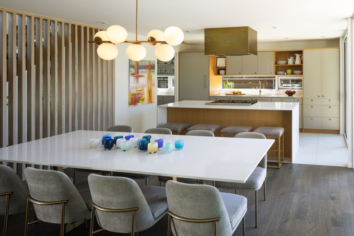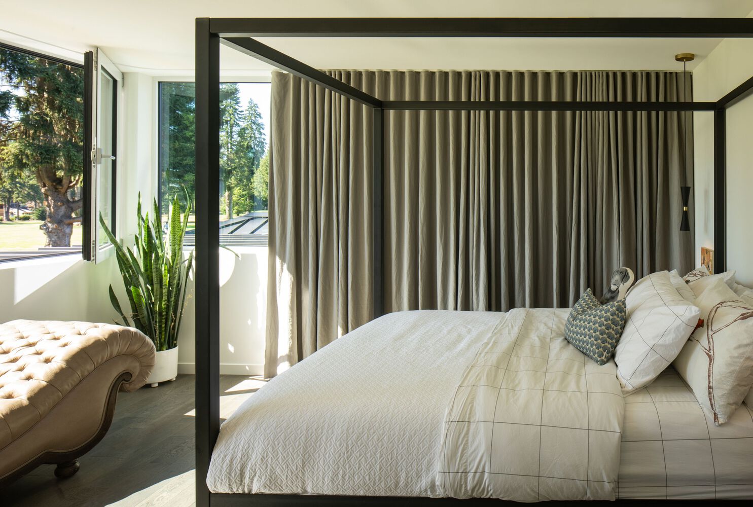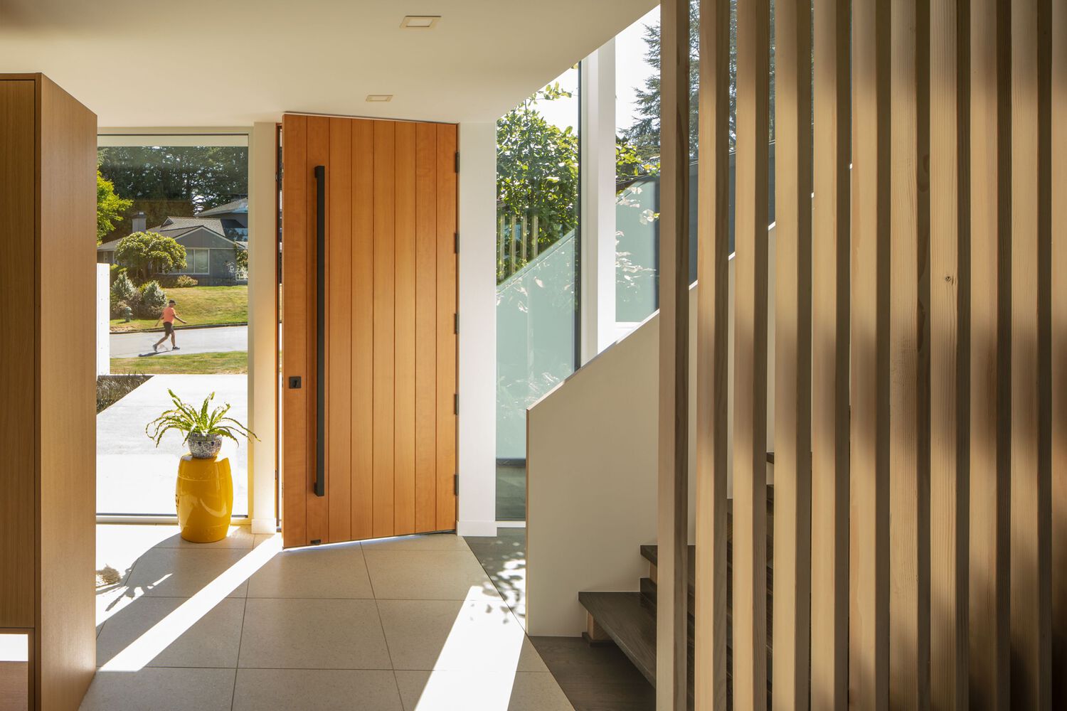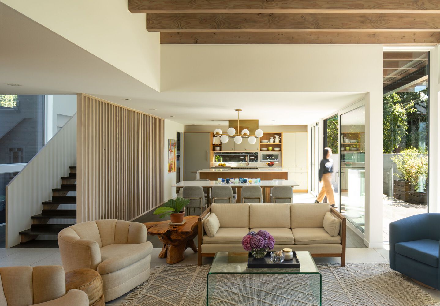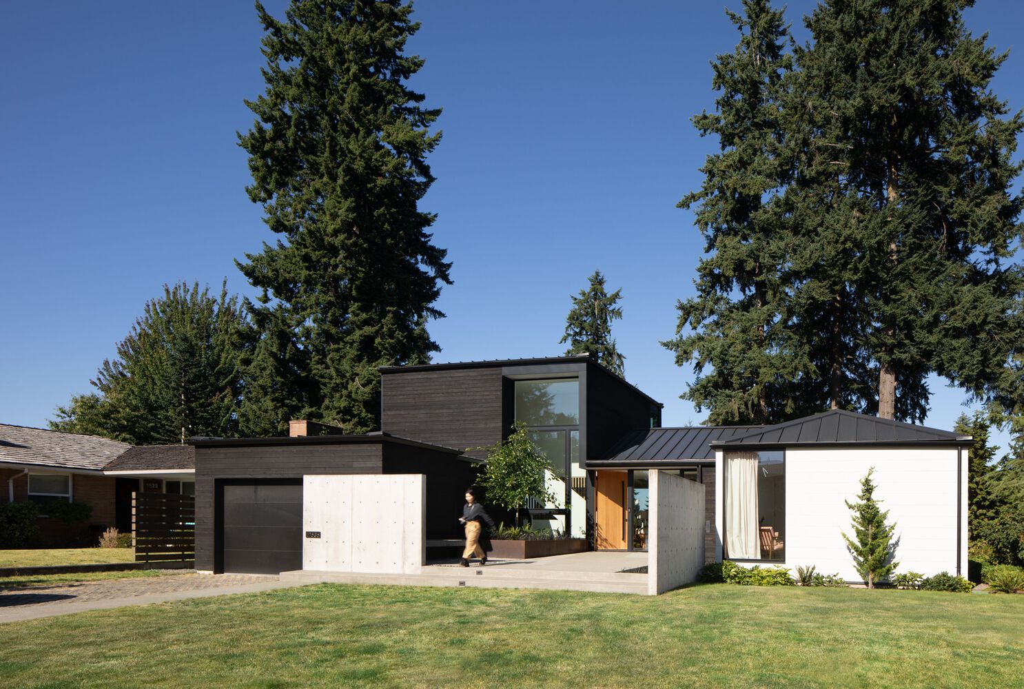 Esta renovación en el Sand Point Country Club de Seattle demuestra el potencial transformador de reutilizar viviendas antiguas. La casa, construida en 1968, respeta su huella original y fusiona interiores y exteriores con dos patios: uno al este, bañando la entrada principal de luz matutina, y otro al oeste, ideal para actividades familiares al atardecer. Espacios interiores definidos por armarios independientes y paredes de listones verticales se abren hacia los patios mediante grandes planos de vidrio deslizante, como la cocina, que inundada de luz natural, se convierte en un santuario solar. Una nueva escalera conduce a una suite principal en el nivel superior, rodeada de vistas tranquilas de árboles maduros. El «ala de los niños» conserva su línea de techo original.