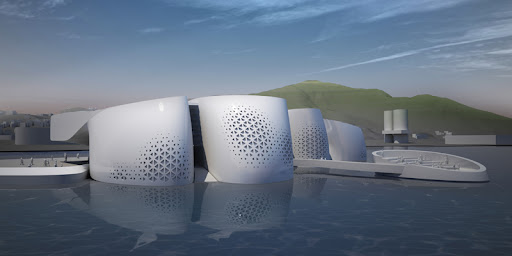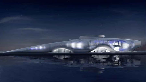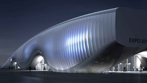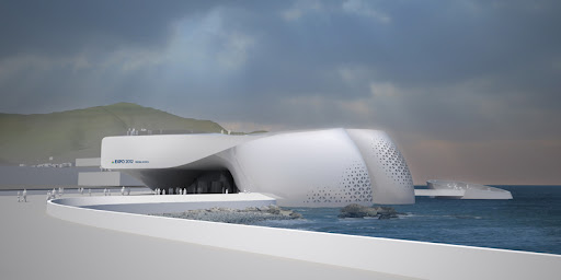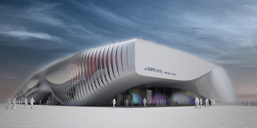 Ubicado en Corea del Sur, el pabellón fue hecho para la Expo Yeosu 2012, cuyo tema es “El océano vivo y la costa”. Construido junto al mar, el edificio destaca por su frente kinético: grandes paneles a la manera de escamas se abren y cierran simulando el movimiento oscilante de las olas. Con la apertura de éstas, se ilumina el interior del edificio, logrando un juego de luces que también es ondulante y “marítimo”, en sincronía con la arquitectura del lugar. Las líneas del espacio recuerdan la forma del océano: lo vertical se convierte en horizontal, y viceversa. La parte posterior del edificio se hunde en el mar, como si éste fuese una creatura que surge de las profundidades, e imita en concreto y arquitectónicamente el movimiento y la esencia del océano.