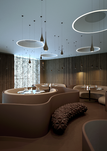 Este espacio cuenta con seis balcones, a través de los cuales los diseñadores han creado el efecto tornado y han dado vida a un conjunto dinámico de interiores con cinco comedores. Las paredes del local están revestidas con listones de madera, dibujando un contraste muy sugerente con la suave superficie de los balcones. Para completar esta atmósfera “climática”, los diseñadores han optado por una iluminación basada en lámparas con forma de gotas que parecen caer del cielo. Pero a diferencia de esta estética de inclemencia meteorológica, Twister es un restaurante que transmite calma, gracias a los tonos naturales elegidos como los ocres, granates y marrones, todo ello para generar una sensación de nido, potenciando con ello la transmisión de calidez y confort. Además, la dupla ha desarrollado un trabajo minucioso en el que todos los elementos de diseño se han cuidado, siendo elemental el orgánico sillón Anana Chair de Aqua Creations, diseñado por Ayala Serfaty, el que nos recuerda los conos de las coníferas y potencian esa sensación natural y sensual que abraza a toda la ambientación.