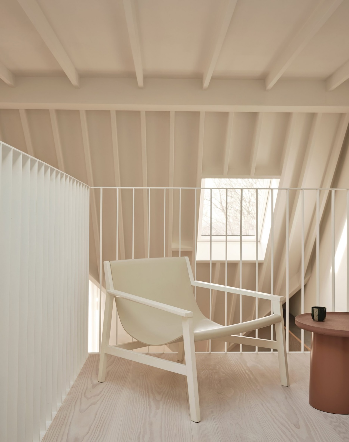 En el centro, un bloque de roble concentra almacenamiento y baño, sostiene el entresuelo iluminado y organiza la transición entre las áreas privadas y el espacio social abierto hacia un balcón. Los acabados blancos, aplicados en vigas y suelos de abeto Douglas tratados con aceite claro, enfatizan la expresividad estructural del techo. Este lenguaje neutro contrasta con la calidez del roble expuesto y con la piedra de cuarzo Taj Mahal en la cocina, generando una paleta equilibrada que combina precisión contemporánea y carácter doméstico.