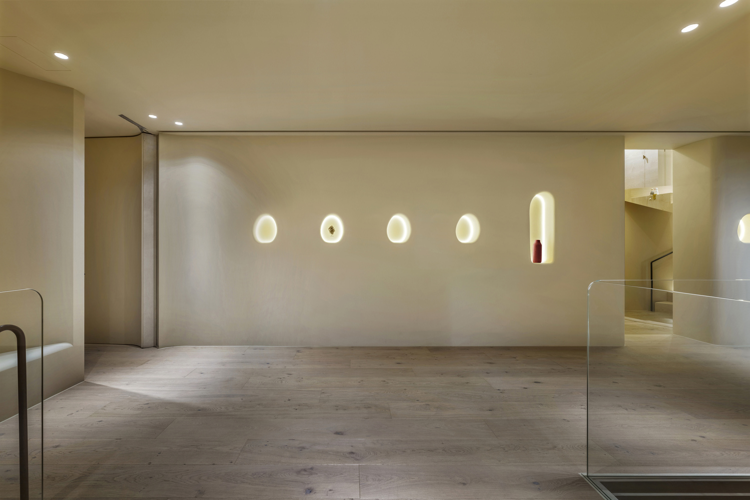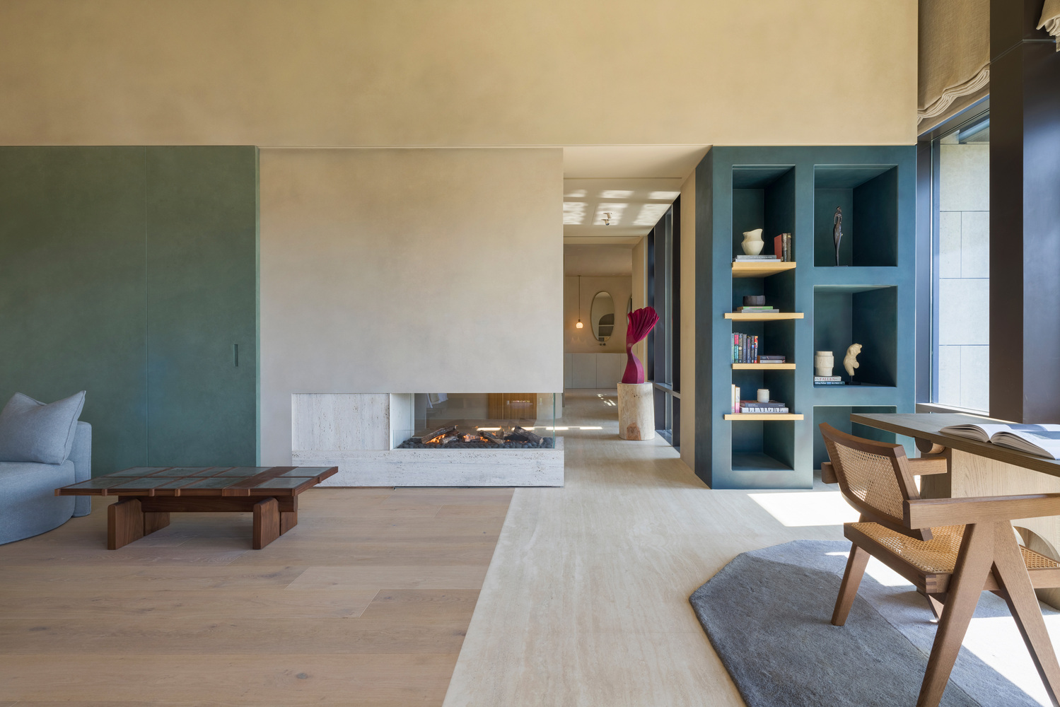 La vivienda se construye como un santuario emocional, con tonos tierra, madera natural y textiles suaves que envuelven los espacios en una atmósfera de calidez silenciosa. El gran vestíbulo de nueve metros y las lámparas de vidrio soplado evocan la niebla que asciende por las montañas, mientras que la planta abierta disuelve límites y jerarquías espaciales, creando un hogar que respira junto a la colina.