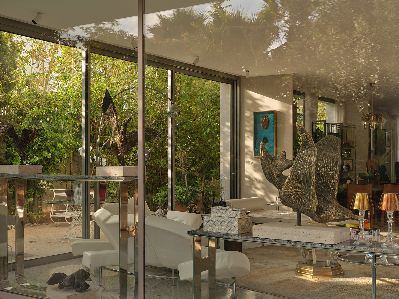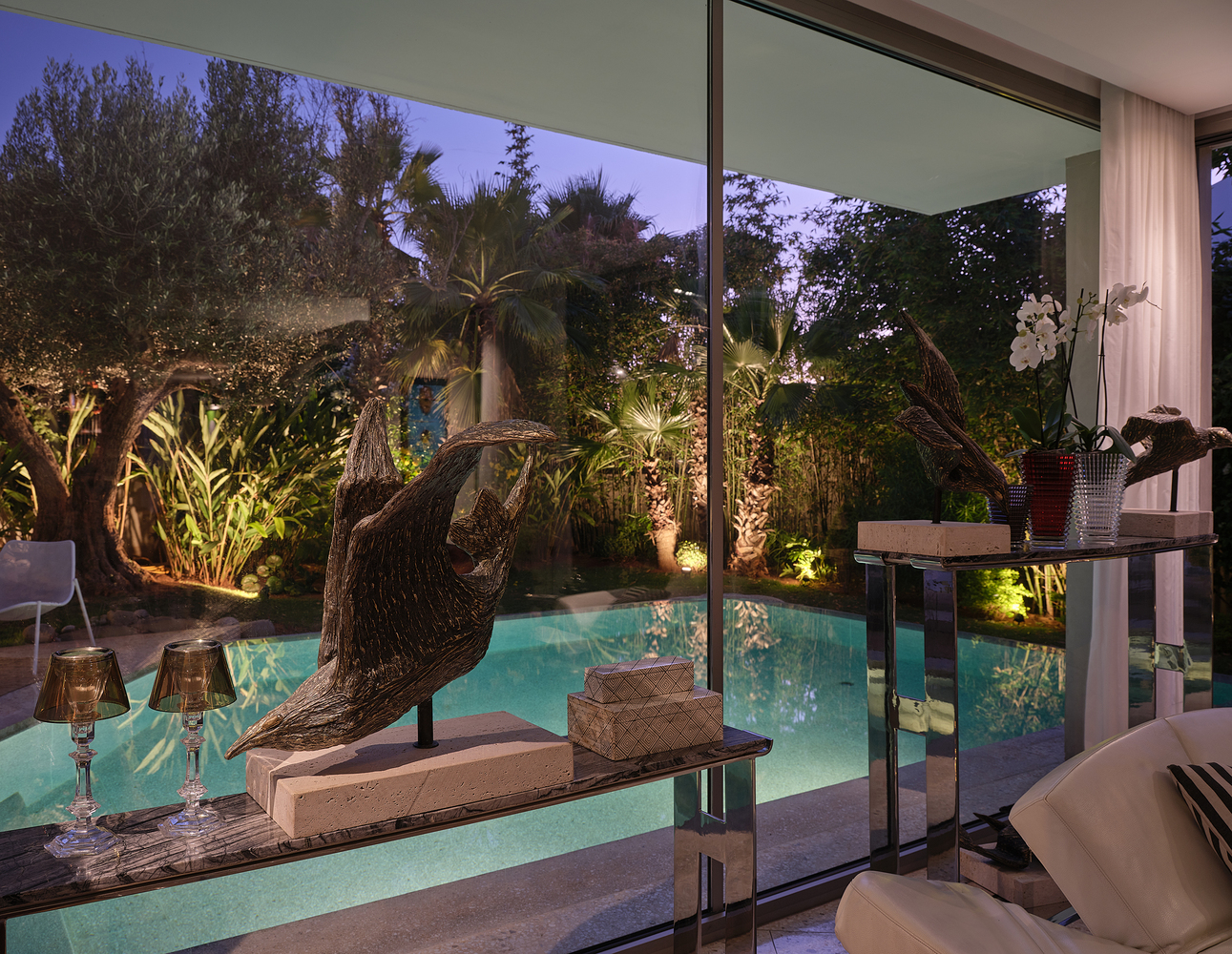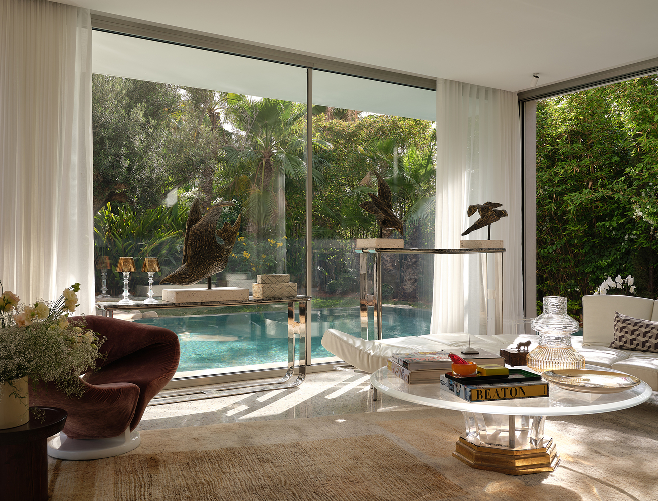 Al frente, la piscina actúa como una extensión natural de la casa, acentuando la continuidad visual entre interior y paisaje. Sobria en su materialidad pero cálida en atmósfera, la casa se enriquece con el carácter de su propietario: un artista local que ha curado cada rincón con piezas de arte y mobiliario con sentido.