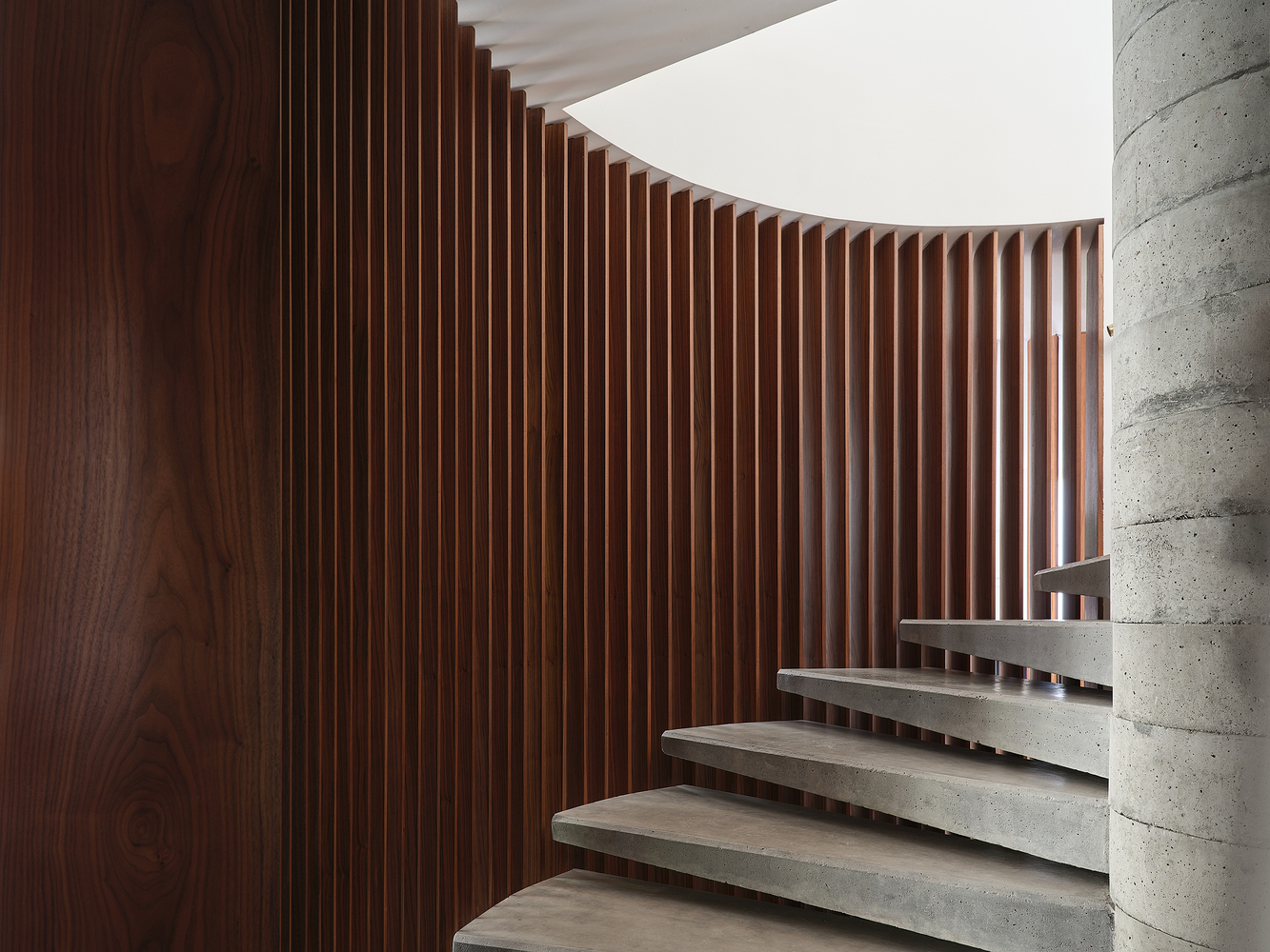 Esta espiral central no solo ordena la circulación, sino que establece un punto de encuentro que organiza, separa y conecta los espacios de forma fluida. Desde allí, se liberan dos zonas: una gran área social abierta y luminosa que dialoga con el exterior a través de amplias correderas de vidrio, y una planta superior más íntima, donde se disponen tres dormitorios conectados por una sala de estar familiar.